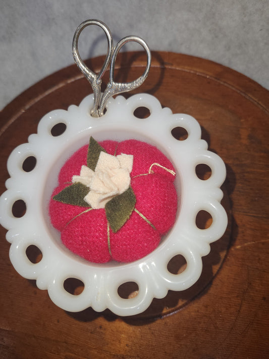 Assemblage Vintage Small Anchor Hocking Old Colony Lace Edge Milk Glass Pedestal Compote Candy pin cushion asm5