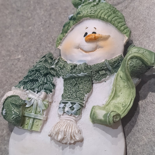 Og1 Polycrylic snowman ornament with a scroll and gift - green