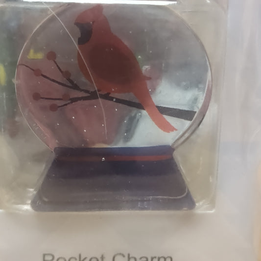 Pocket charm snow globe appearance with cardinal inside. Your friendship is a blessing every day of the year