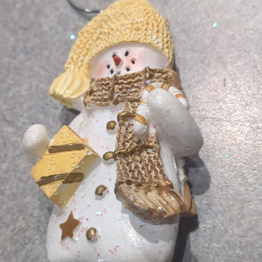 Oy3 Polycrylic snowman ornament with candy cane and gift yellow