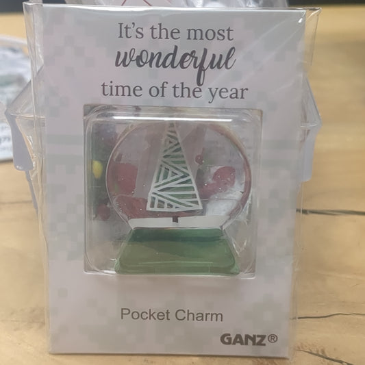 Pocket charm snow globe appearance with tree inside. It's the most wonderful time of the year