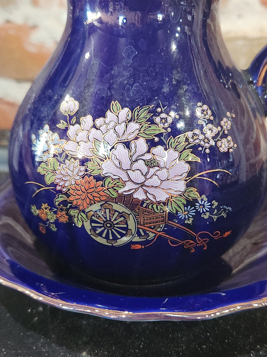 Porcelain Small Pitcher Bowl Set Taiwan Blue Floral Gold Trim Accent pit23