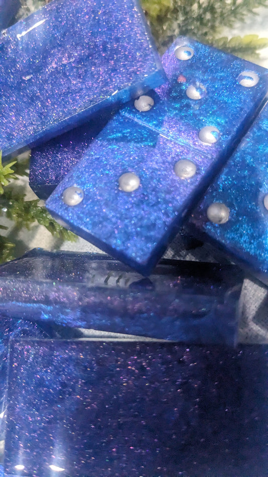 This is a set of handcrafted resin dominoes color changing blue and purple