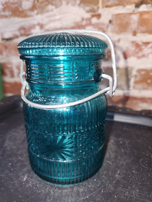 Vintage ATLAS E-Z SEAL Blue Mason Pint Jar glass lid Wire Bail Trade Mark Reg cornflower light aqua blue jar88