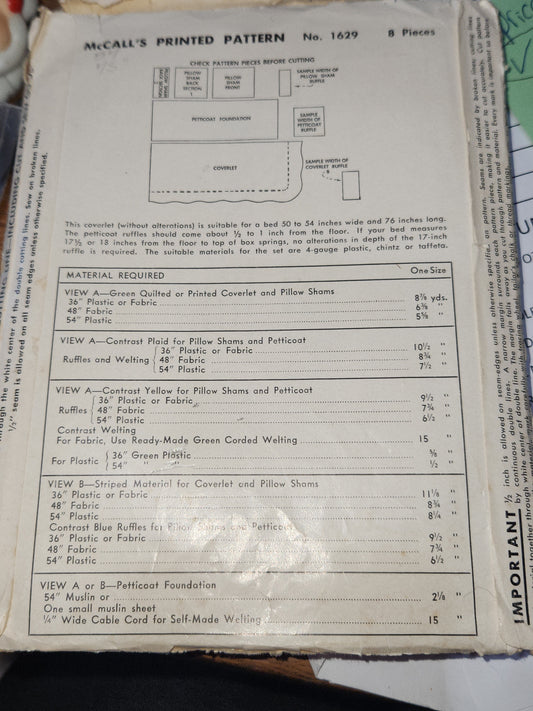 Vintage McCall's 1629 Double Bed Coverlet Petticoat Pillow Shams 1951 Sewing Pattern