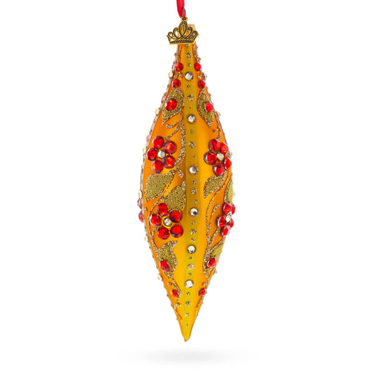Gold and Red Floral Jeweled Elongated Pointed Teardrop Finial Glass Christmas Ornament