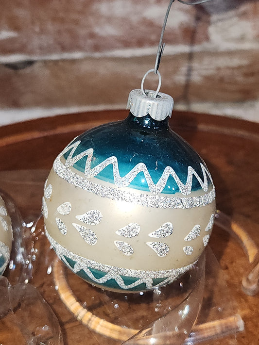Vintage Shiny Brite Set of 4 Glass Ornaments with Same Design with Silver Stripes and Mica Accents. 2 Matching Gold and 2 Matching Blue sb6