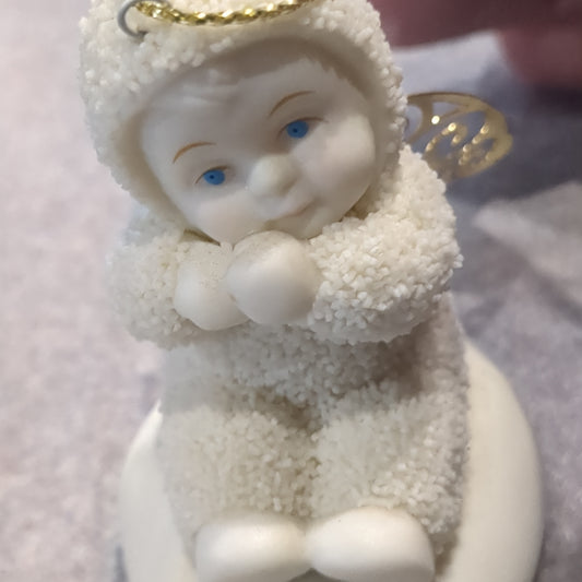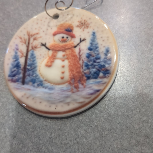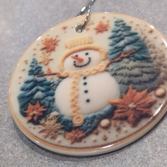 Ceramic ornament snowman with Trees, poinsettias yellow scarf and yellow hat