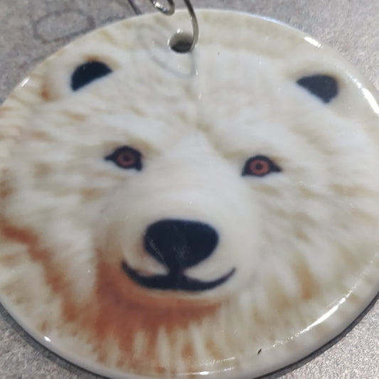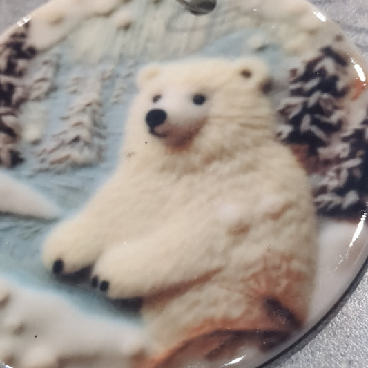 Ceramic ornament with a polar bear the lake and mountains and trees in the background, it appears 3D but it is not