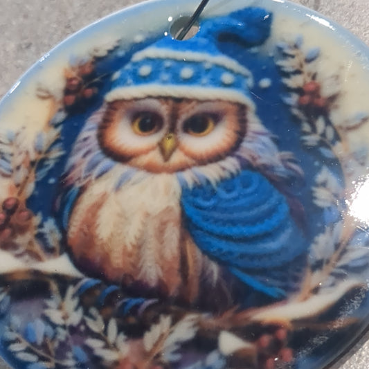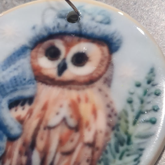 Ceramic ornament with an owl in a dark blue hat and blue scarf, it appears 3D but it is not