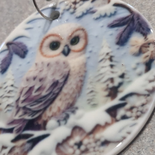 Ceramic ornament with an owl sitting on a branch, it appears 3D but it is not