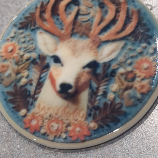 Ceramic ornament with a deer head surrounded by flowers and leaves, it appears 3D but it is not