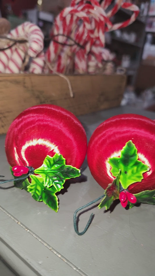 Vintage Red Satin Spun Silk Christmas Ornament 2" Ball With Green Holly Leaf and Green Metal Hanger