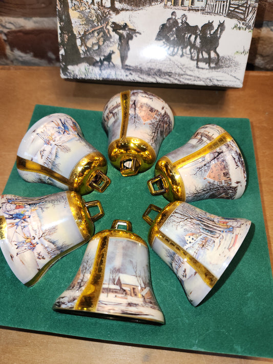 Vintage Currier & Ives Season's Greetings Christmas Bell Ornament Set of 6 bo03