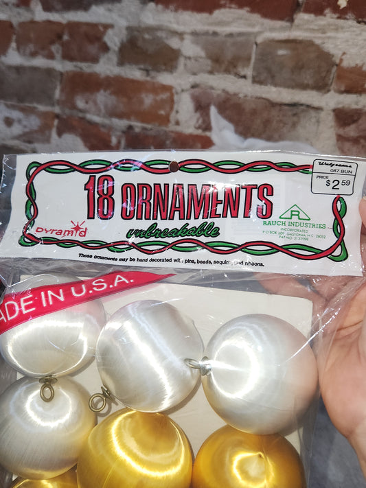 Vintage Pyramid set of 18 Satin unbreakable ornaments 2" unopened NOS bgo8