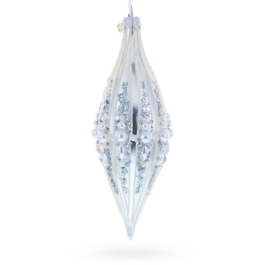 Pearl and Glitter Jeweled Elongated Pointed Teardrop Finial Glass Christmas Ornament