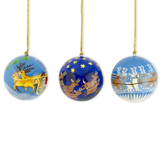 Set of 3 Night Sky Reindeer & Santa Sleigh Wooden Christmas Ball Ornaments