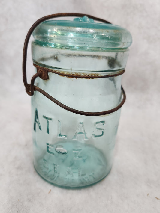 Vintage ATLAS E-Z SEAL Blue Mason Pint Jar glass lid Wire Bail Trade Mark Reg cornflower light aqua blue jar88