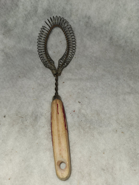 Vintage utensil twisted coiled whisk stainless steel worn red wooden handle kit558