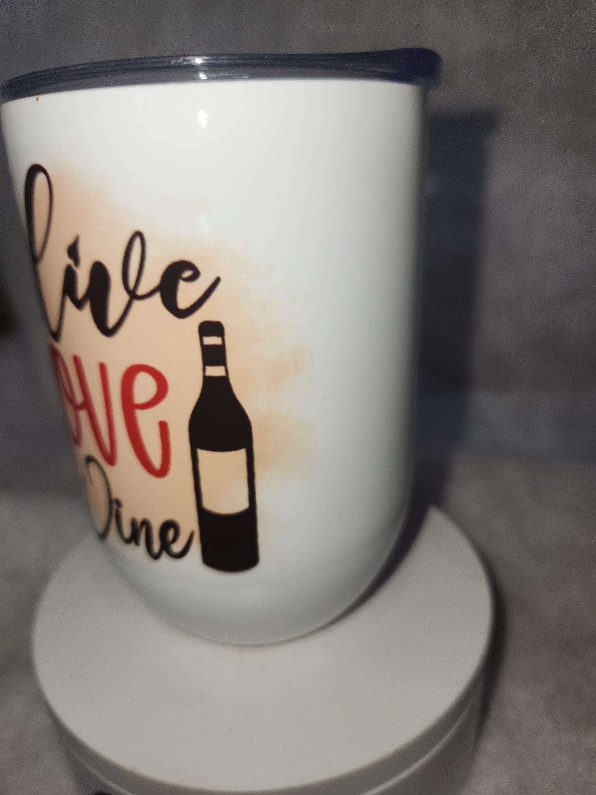 12 oz stainless steel wine tumbler it says Live Love Wine wt5
