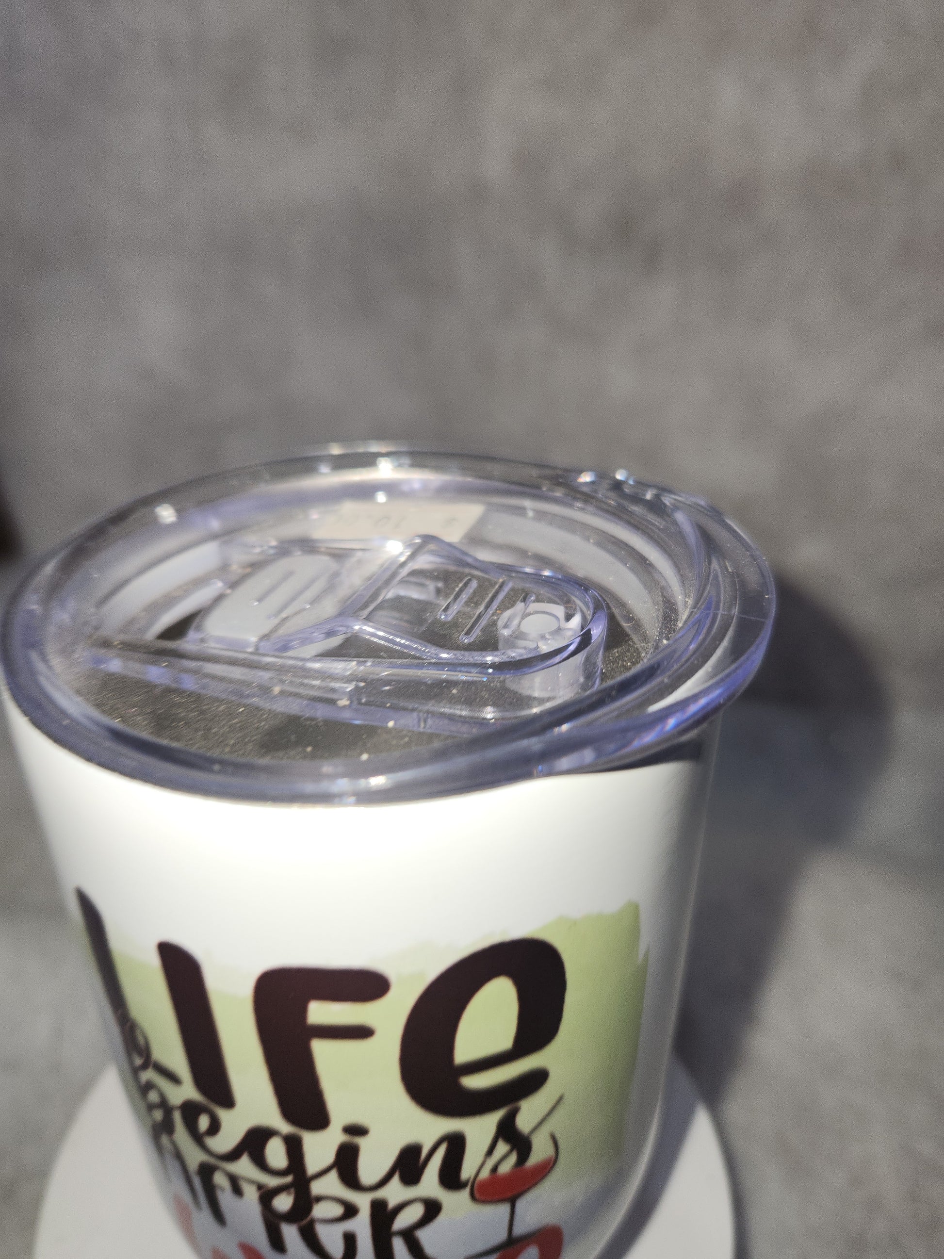 12 Oz stainless steel wine tumbler. It says life begins after wine wt3