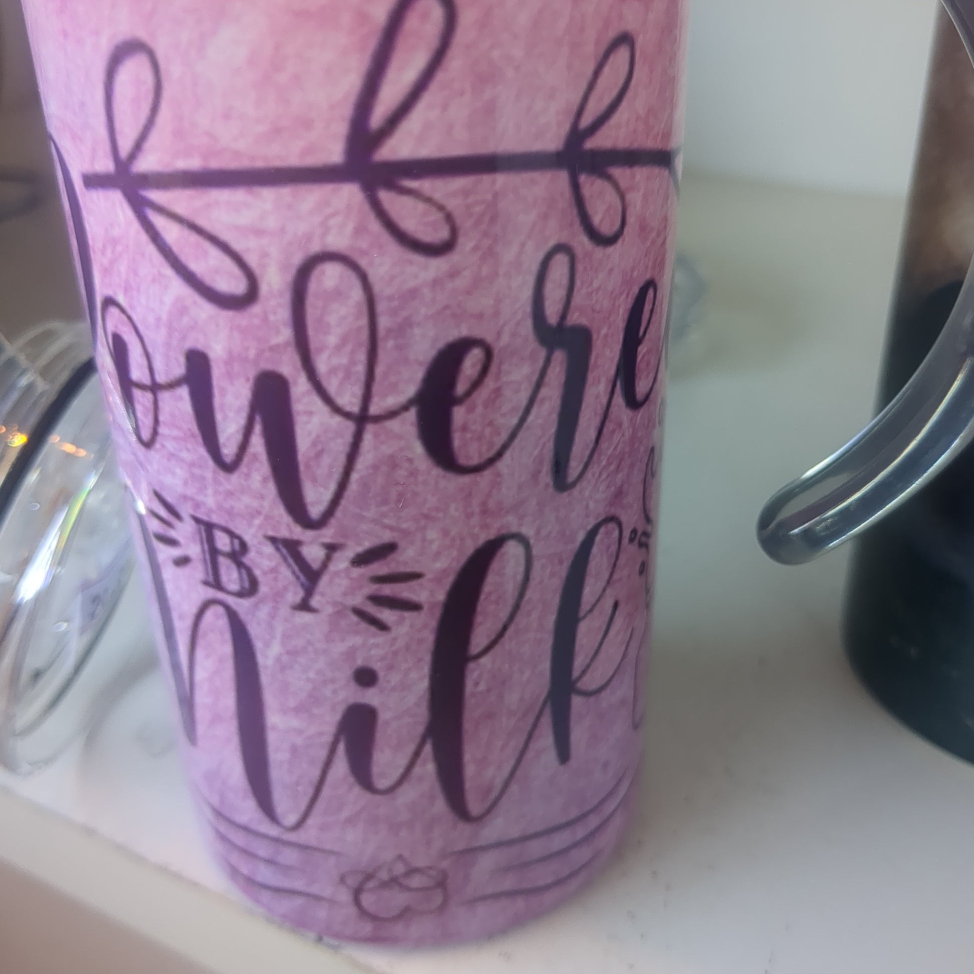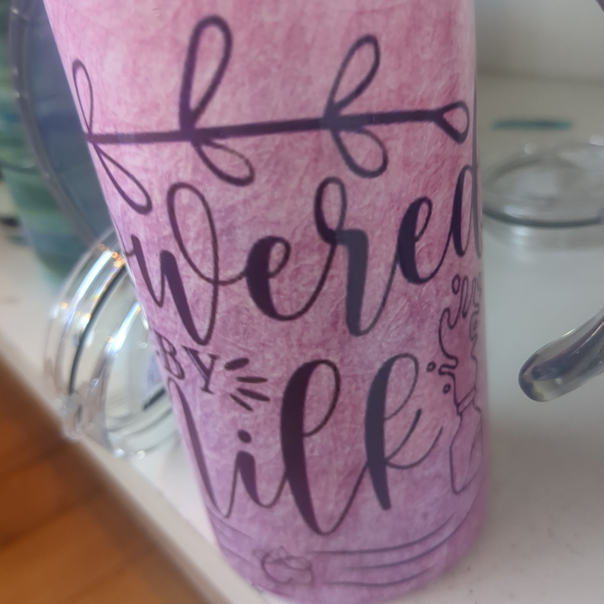 12 oz Tumbler that has a sippy cup top and a regular tumbler top. The design is sublimated on it. It says powered by milk with pink and purple. Please avoid extreme temperatures and hand wash only