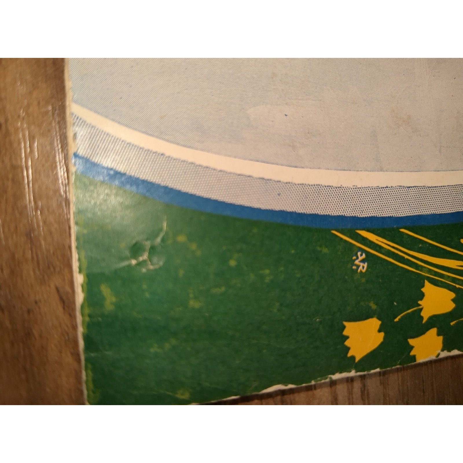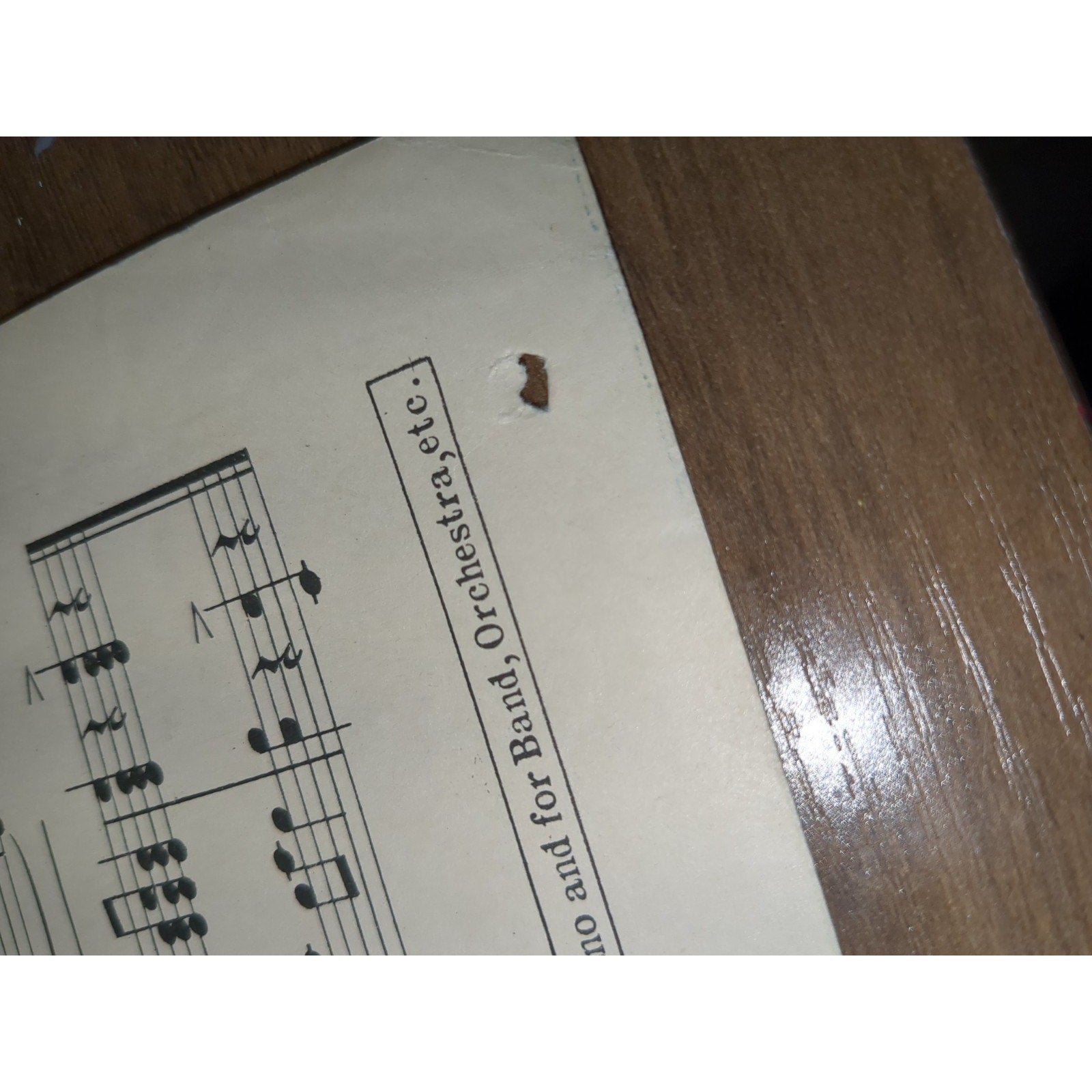 The sheet music has some beautiful colors missing fairly good condition for its age there is a rip in The binding about 3 and 1/2 in from the bottom up the middle page is not connected but it doesn't look like it ever really was the back has a little hole in it the front page has some wear it has some spots the colors have been scraped off and there is a name in pencil on the front. Please see photos as bad as part of the description. Do combine shipping