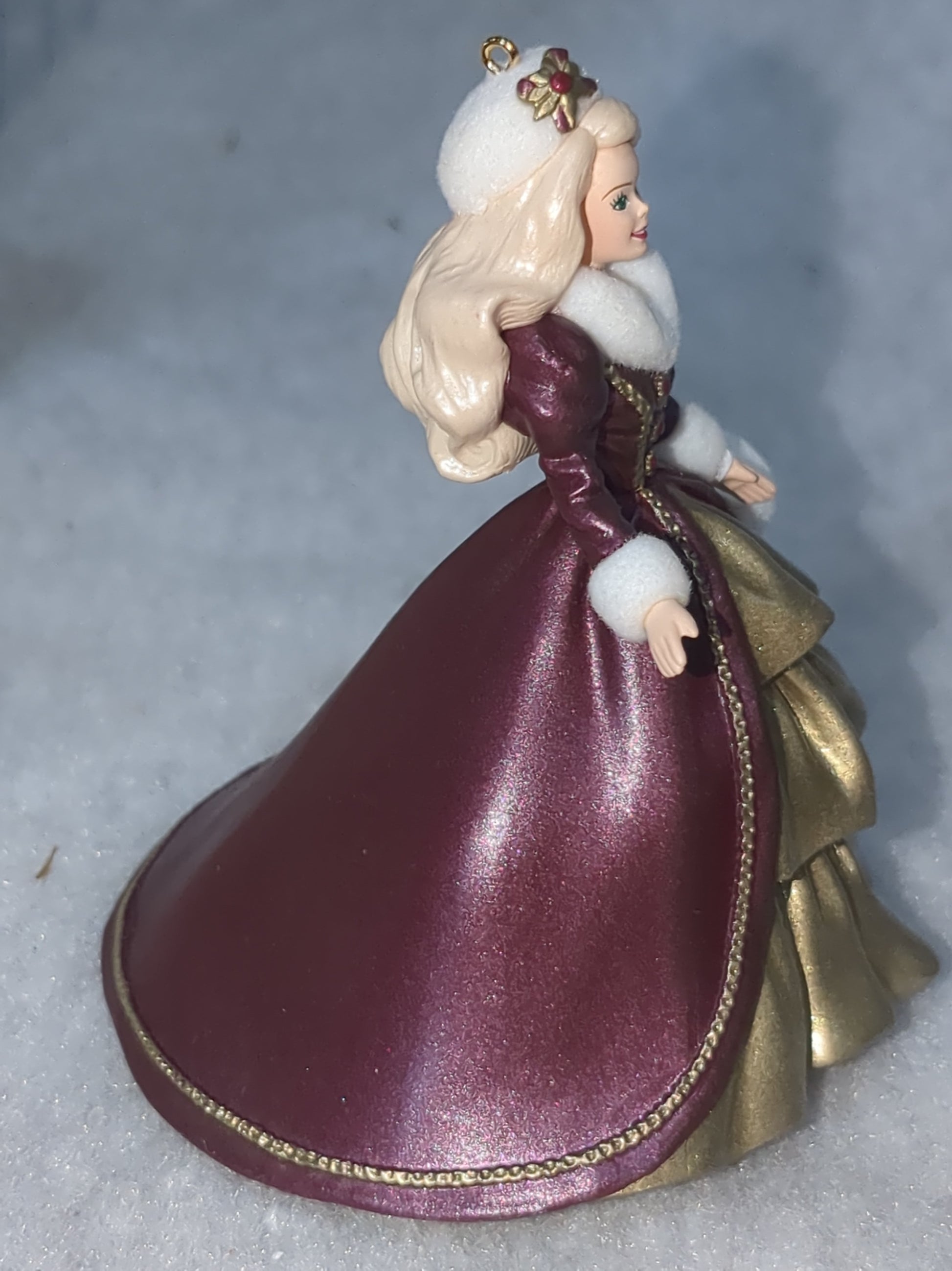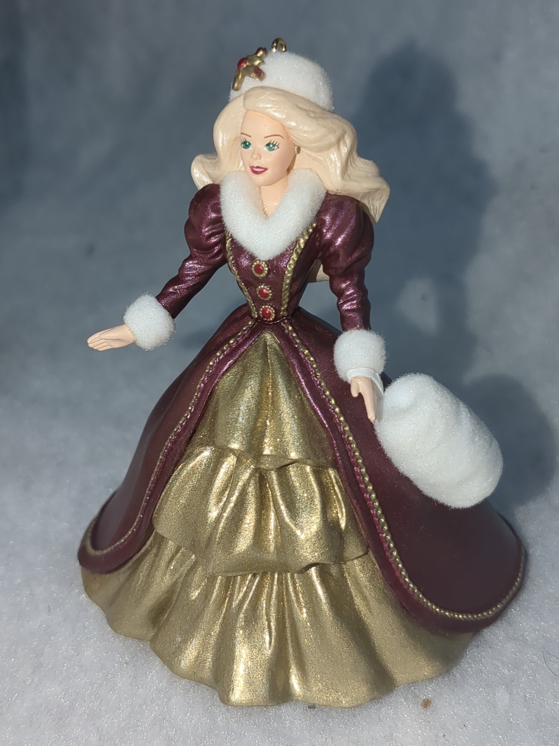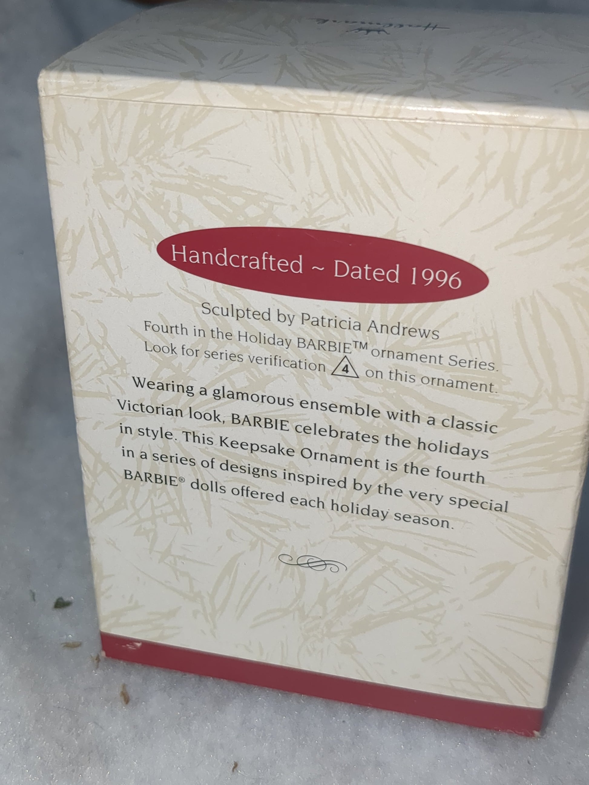 This is the fourth ornament in the Holiday Barbie series from Hallmark she is in very good condition it has the box the ornament is wrapped in plastic bag and plastic to hold her safe in the box. Please see photos as they are part of the description and we have other Barbie ornaments available in our shop.