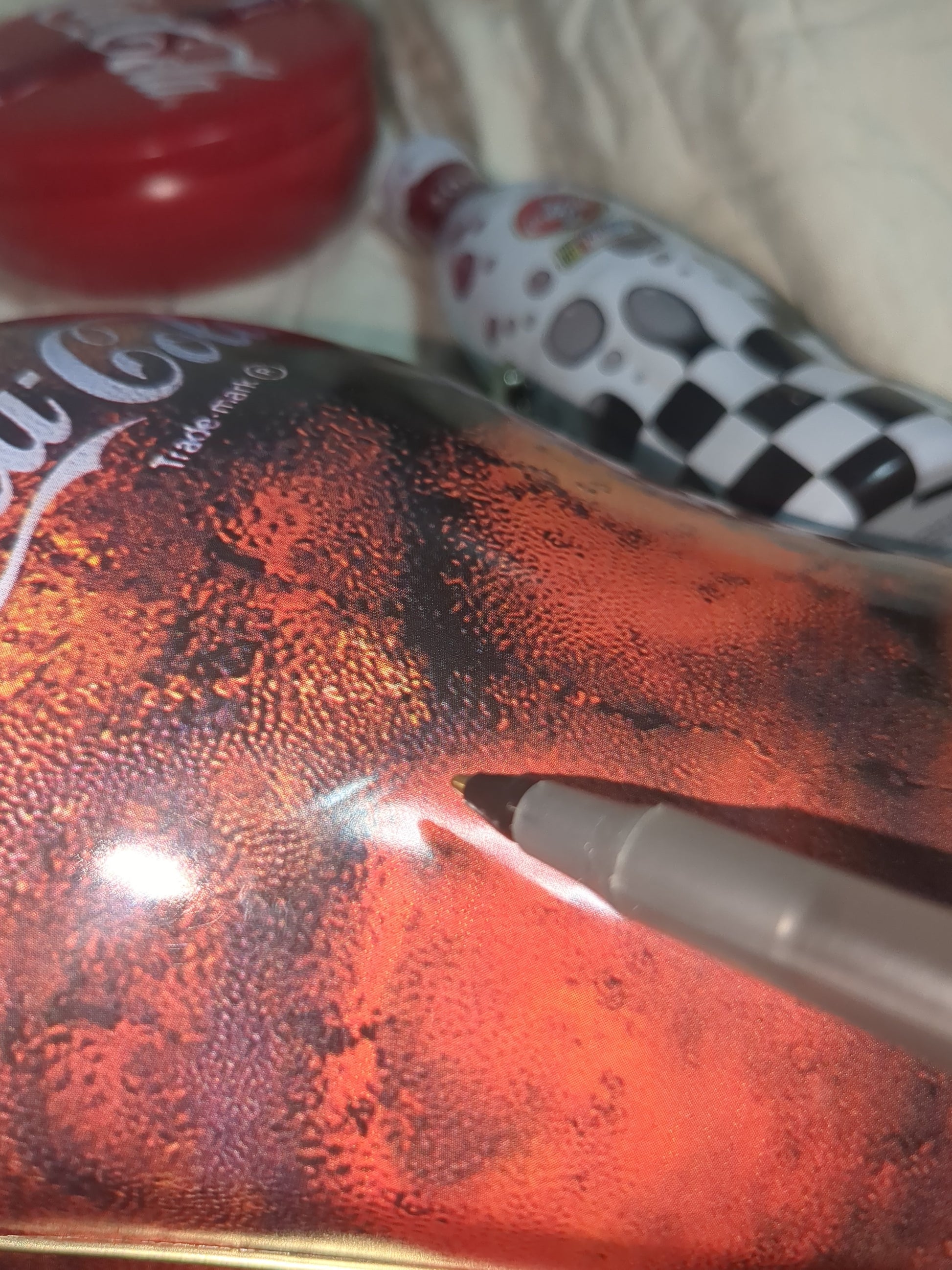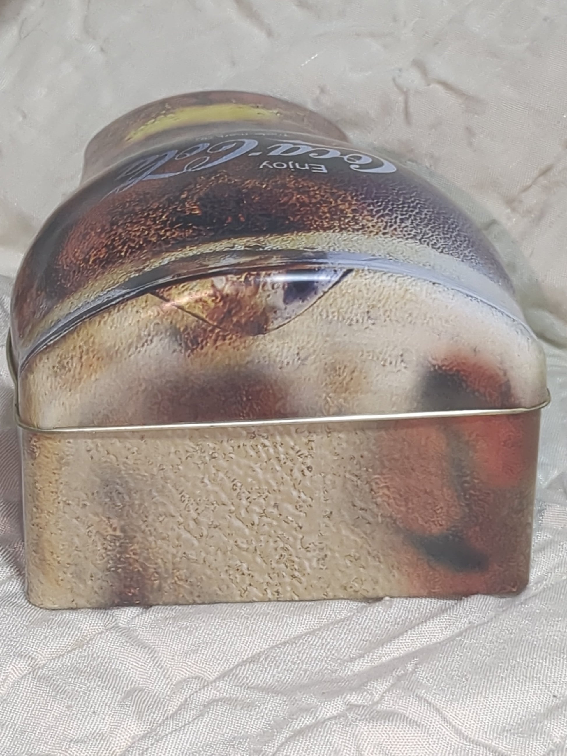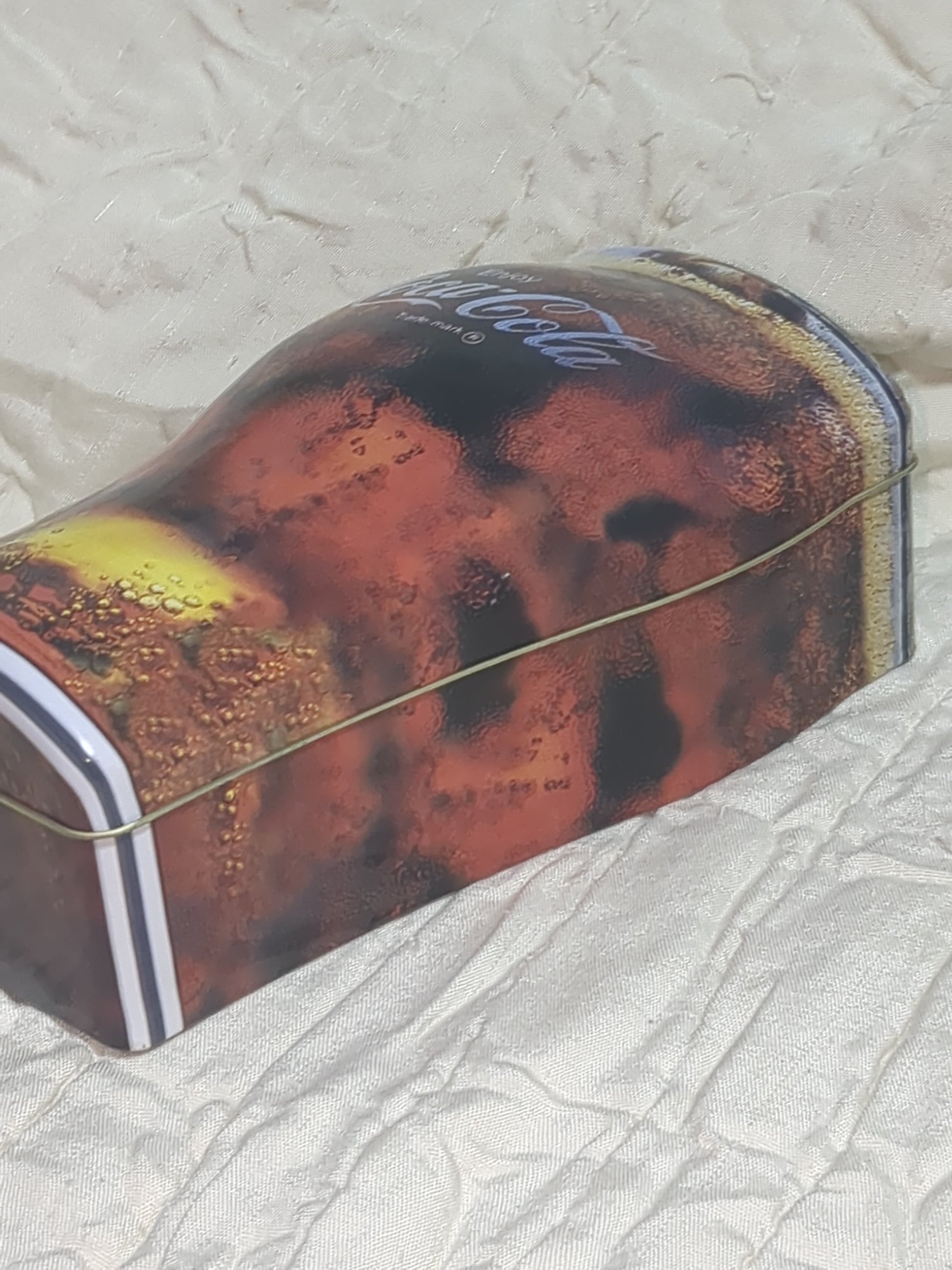 This is a large tin shaped like a cold, icy, bubbly glass of Coca-Cola. distributed by Houston Harvest Gift Products, but it is made in China. The inside of the tin is in good condition. There is one area on the tin is a circular tiny dent I'm not sure if it was made manufacturing or not. Please see the photos as they are part of the description