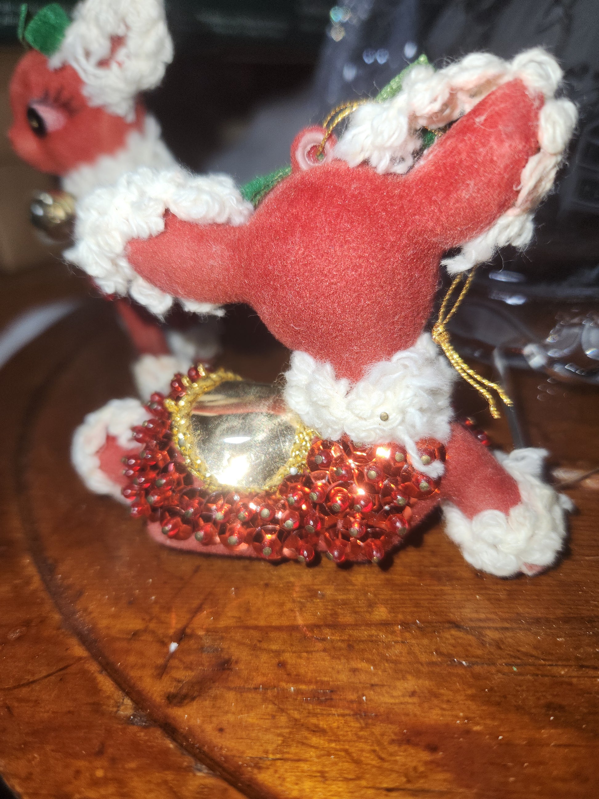 This is a set of two vintage flocked reindeer with push pin sequins and lace trim. Included is a bag of lace trim that came with them. They are 3 and a 1/2 inches wide.The standing reindeer is 3 and a 1/2 inches tall.The laying reindeer is two and three quarters inches tall. I belive all the sequins are present, but please see photos as they are part of the description.