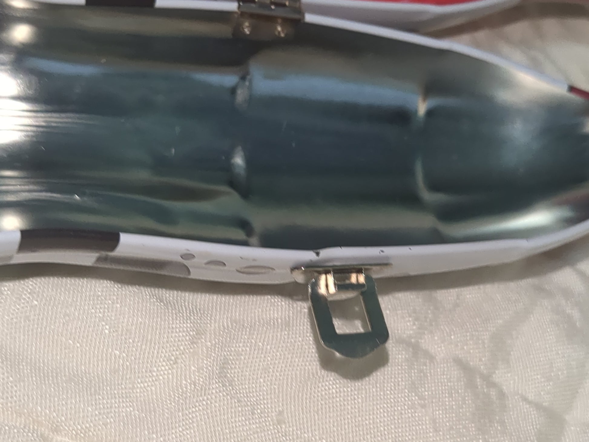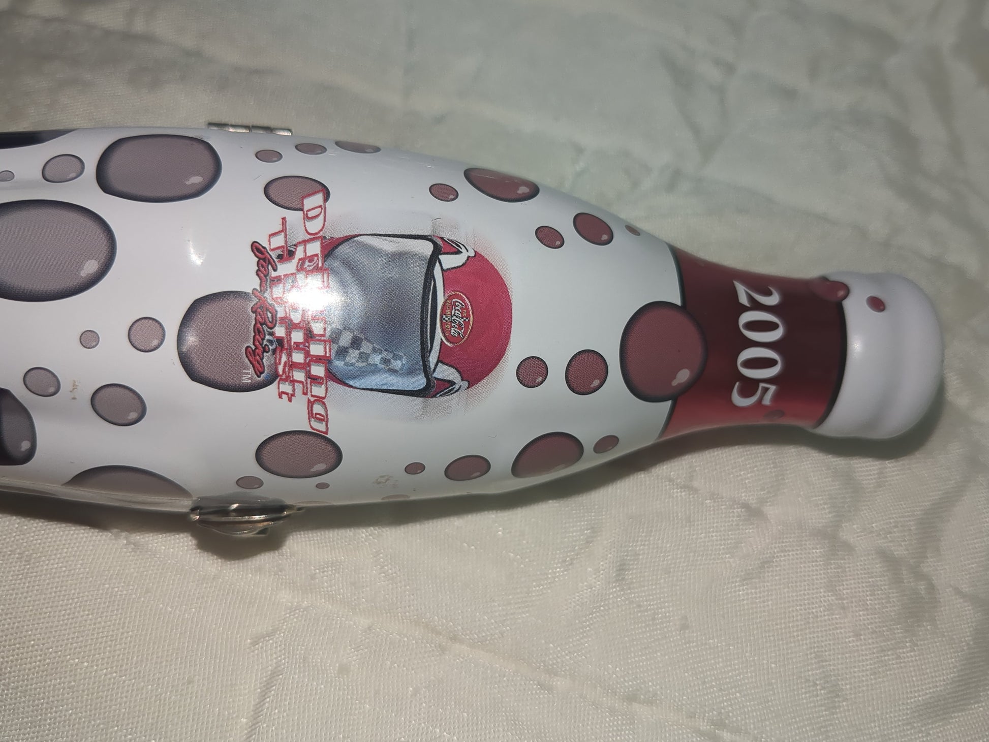This is a bottle-shaped tin approximately 7 1/2 in tall. It has a little clasp and it opens maybe a pencil case. It is in pretty good condition don't see any major scratches or dents in this piece. It opens well. It looks good on the inside. Please see the photos as they are part of the description.
