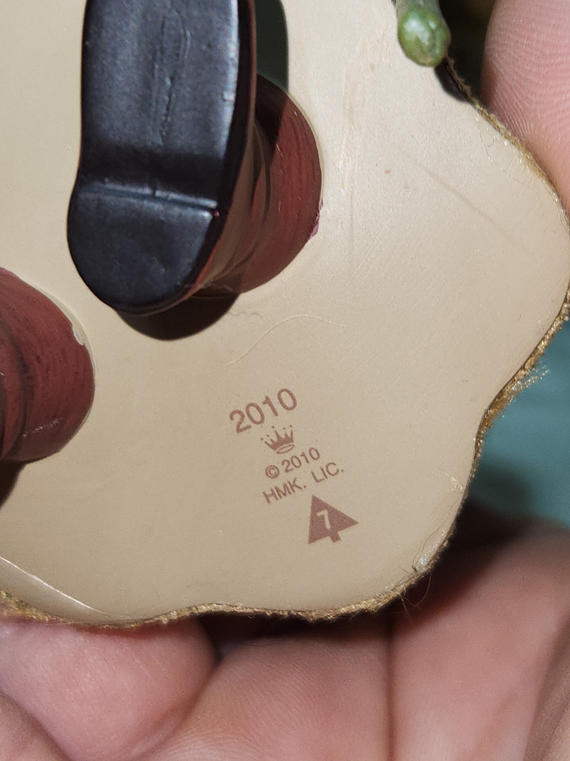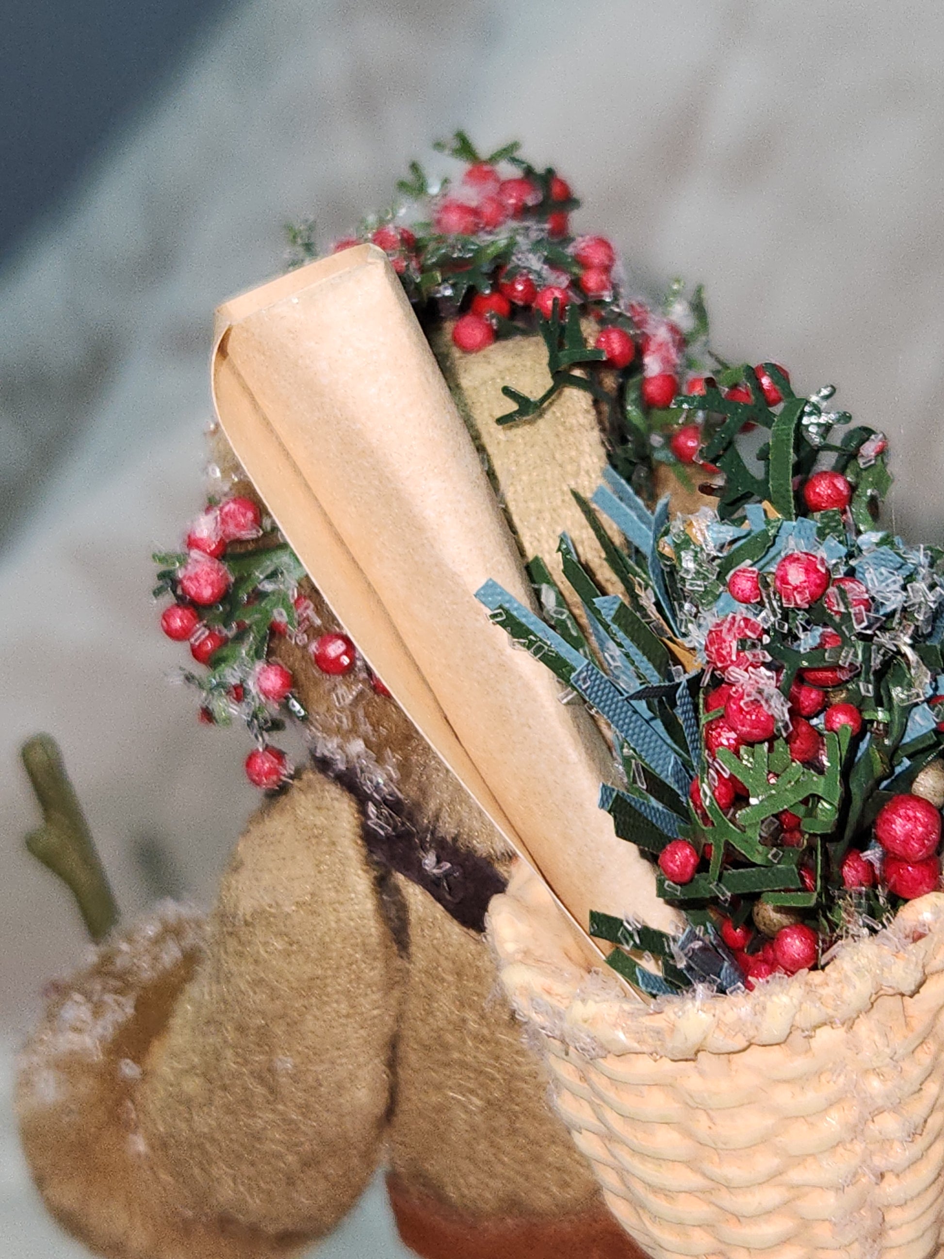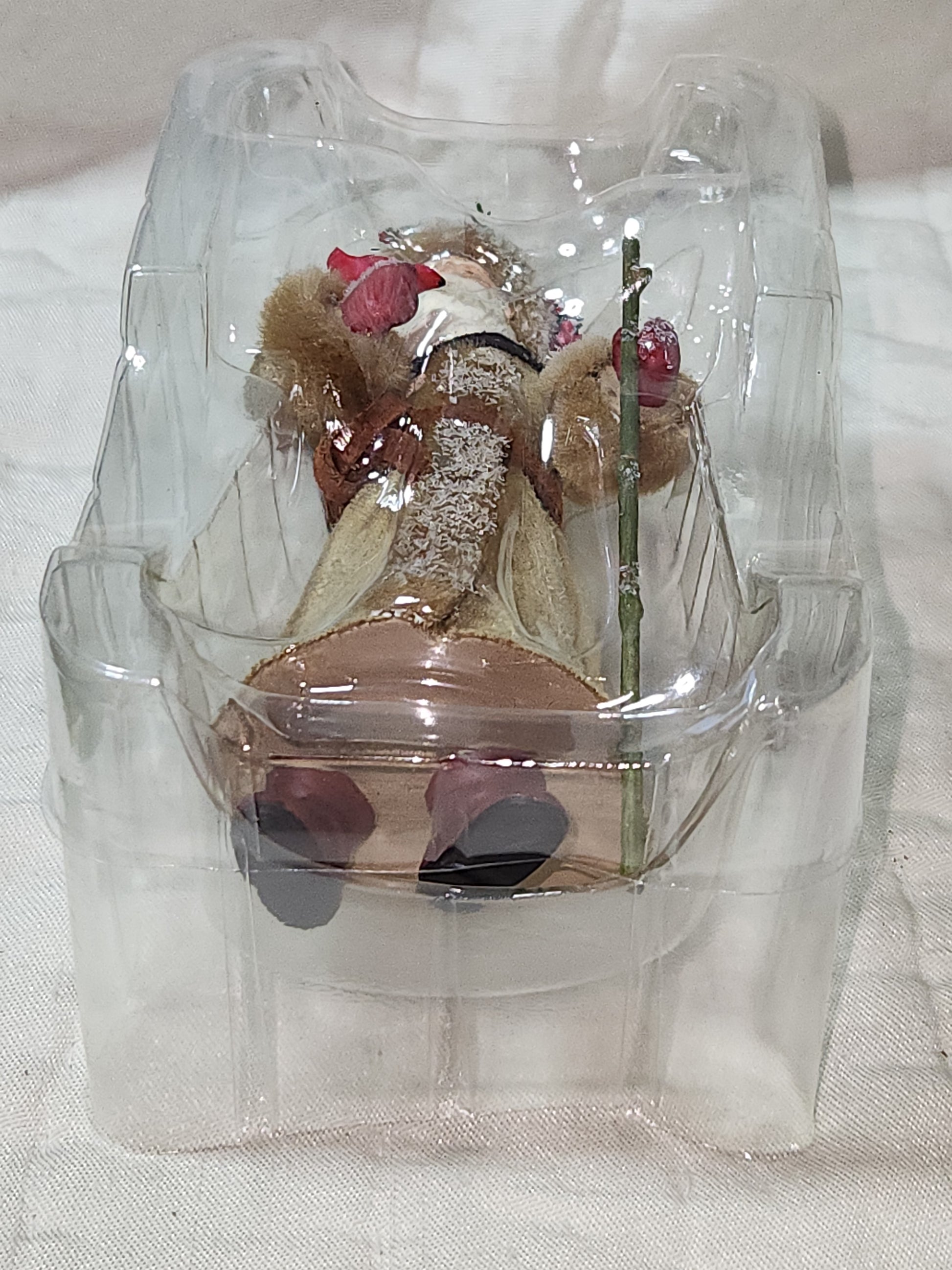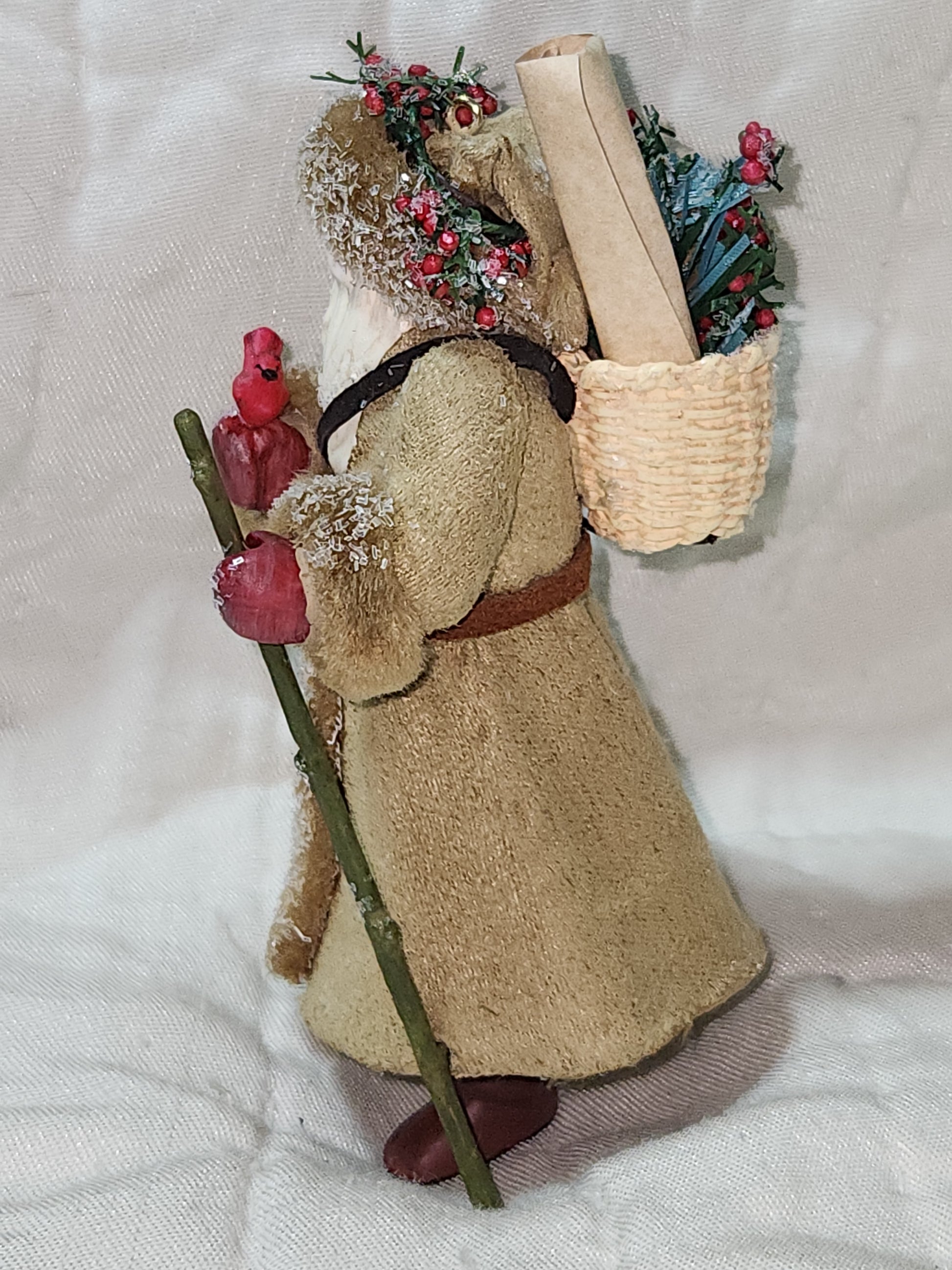 This ornament has a soft velvet coat and fabric bag on its back. It is in good condition. It is in a plastic holder in its original box. Please see photos as they are part of the description.