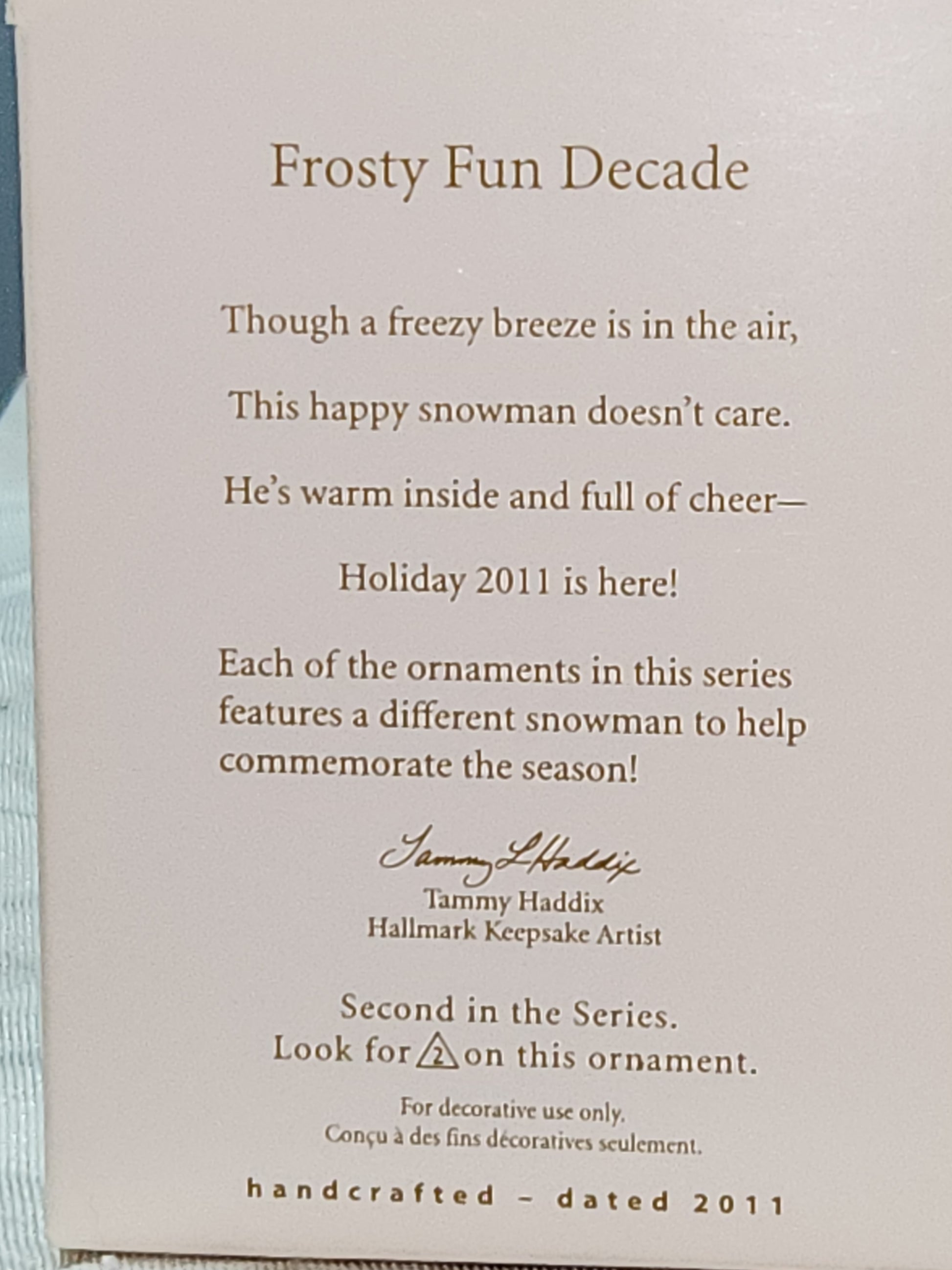 Hallmark Keepsake Ornament 2011 Frosty Fun Decade 2nd in Series Snowman