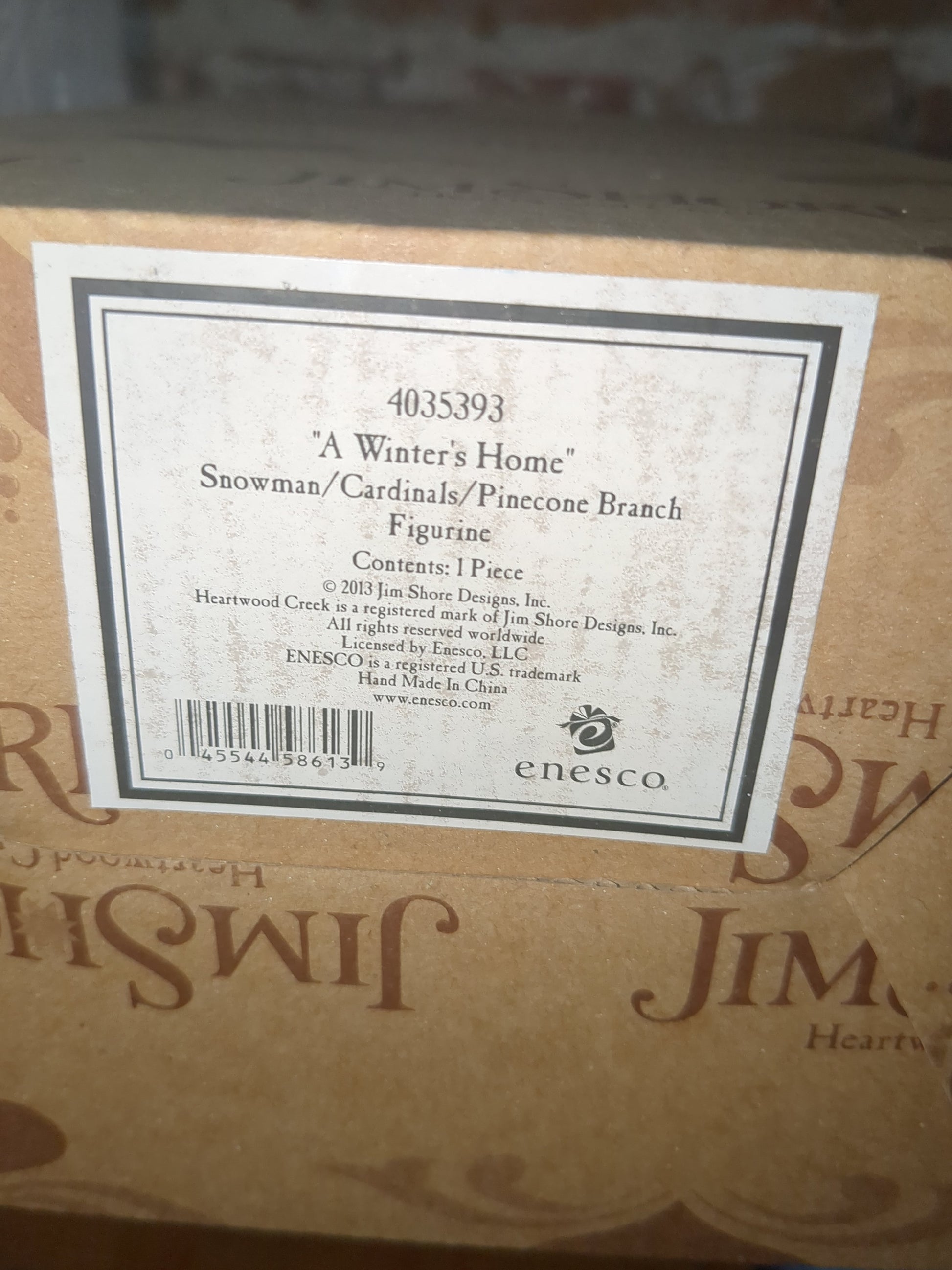 This is a 2013 Jim Shore Enesco A Winter's Home Snowman Branch Cardinals No.4035393. This comes with packaging and box. It is pre-owned but like new condition.No chips or cracks, some shelf ware to box. Please see the photos as they are part of the description.