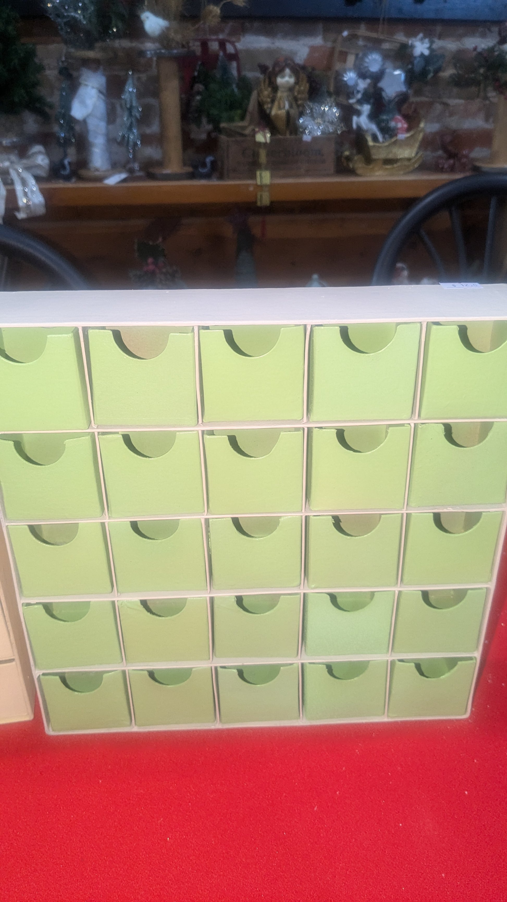 25 little boxes that come out of the frame to use for Advent vacations Christmas countdown countdown back to school. This one is Granny Apple green and Ivory