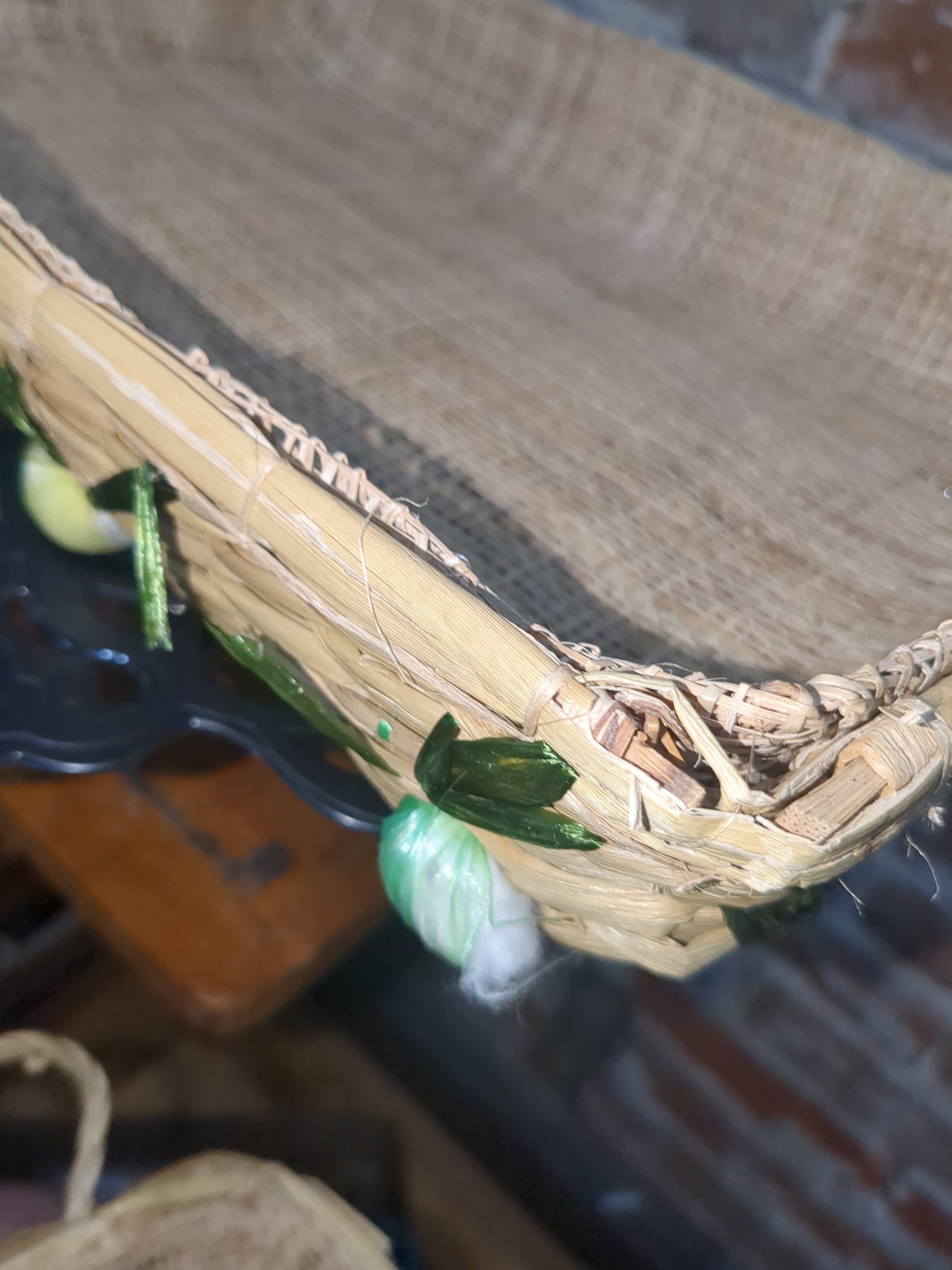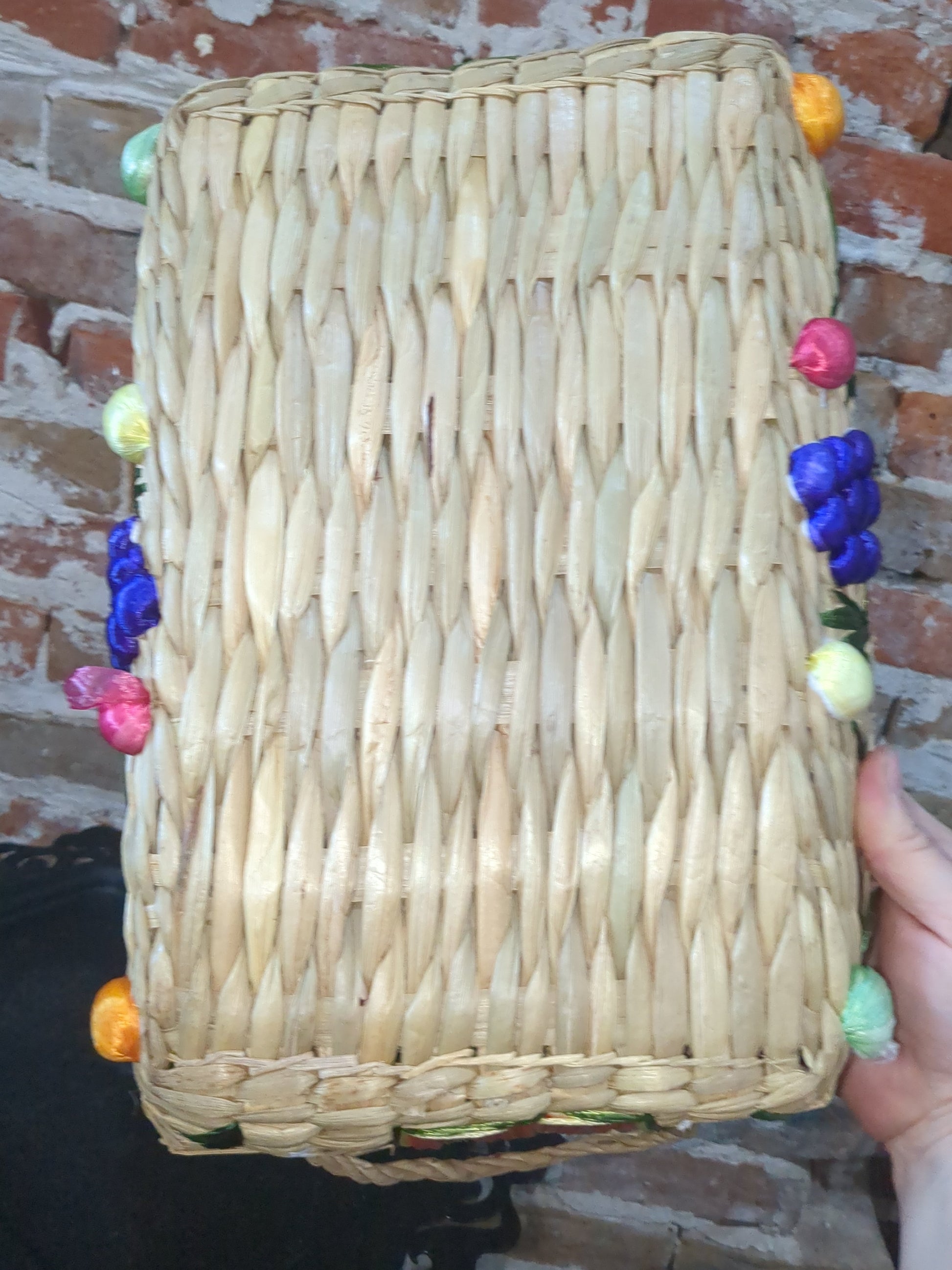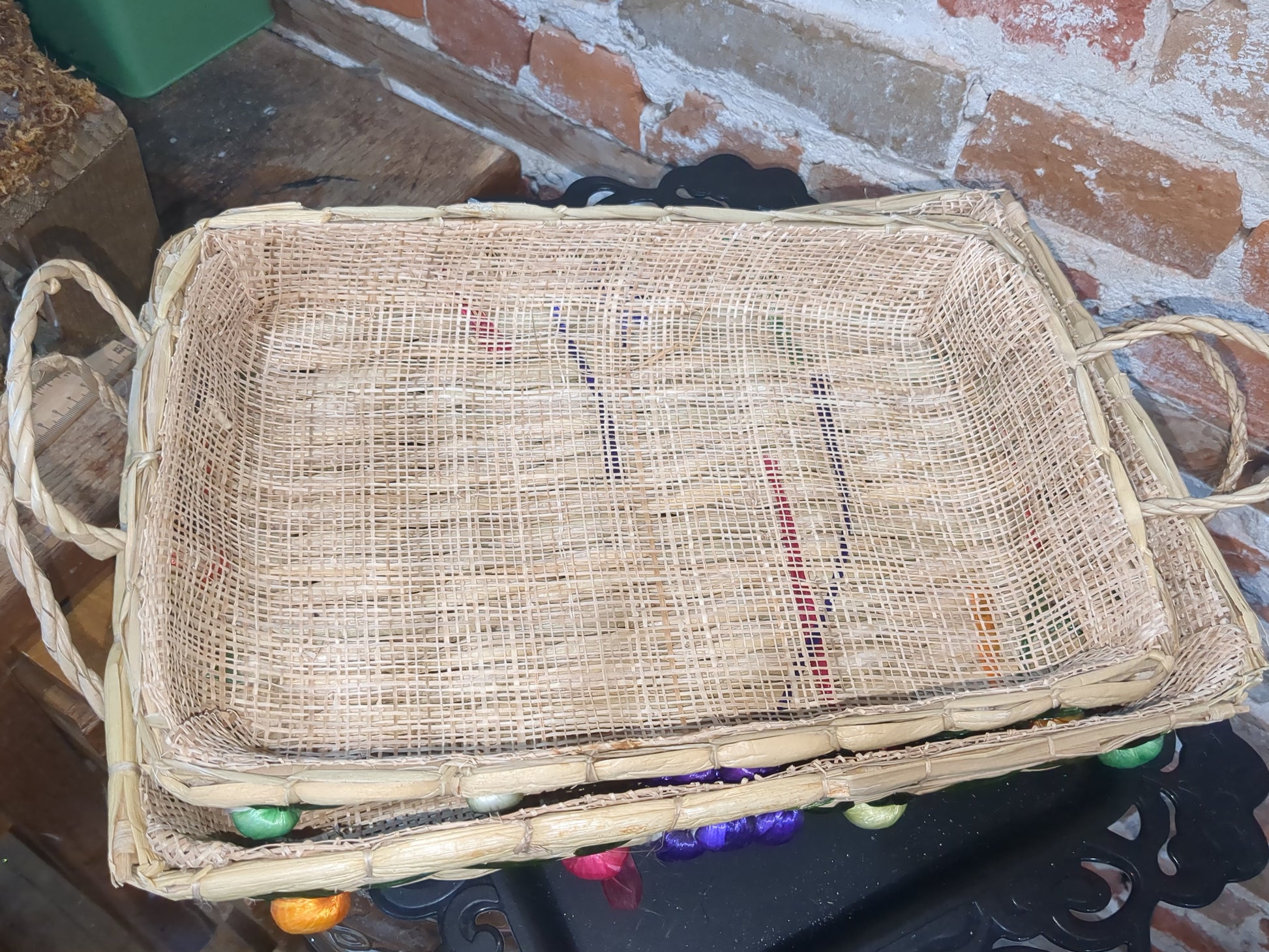 This is a set of three baskets with a woven material inside and straw fruits and vegetables on the outside. They stack right inside of each other and they all have the same types of fruits and vegetables on them. They are in vintage used condition but still highly intact and are useable.please see photos as they are part of the description.