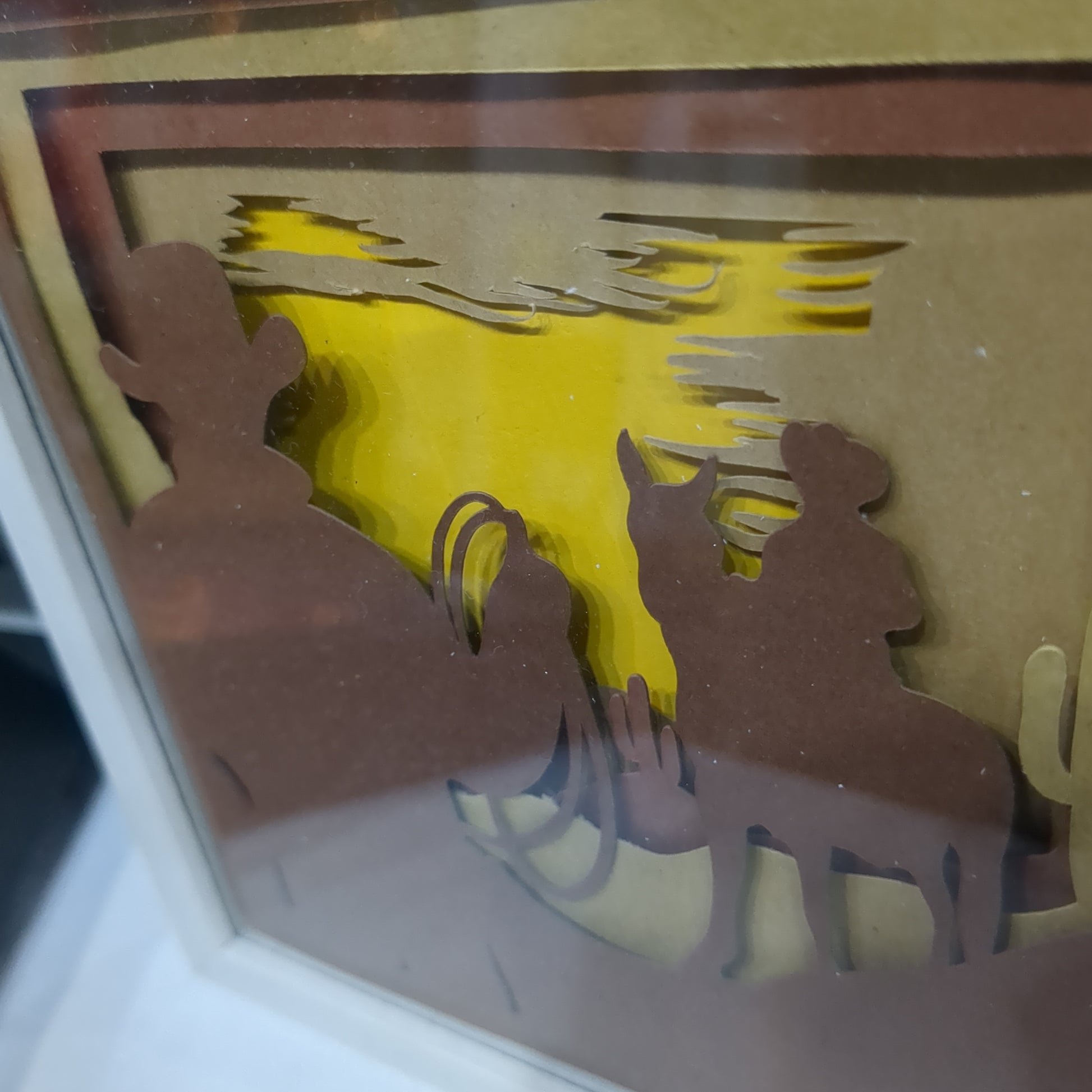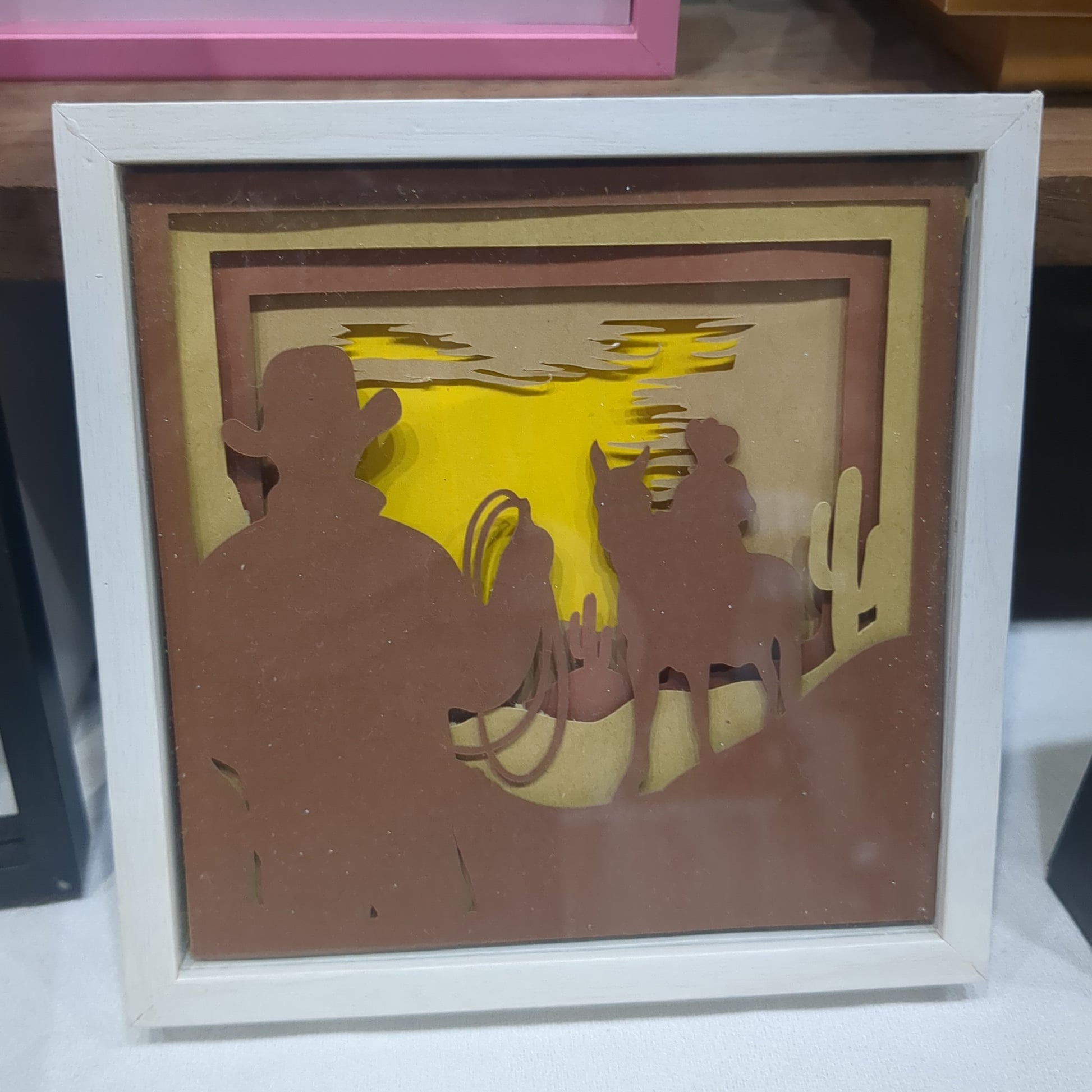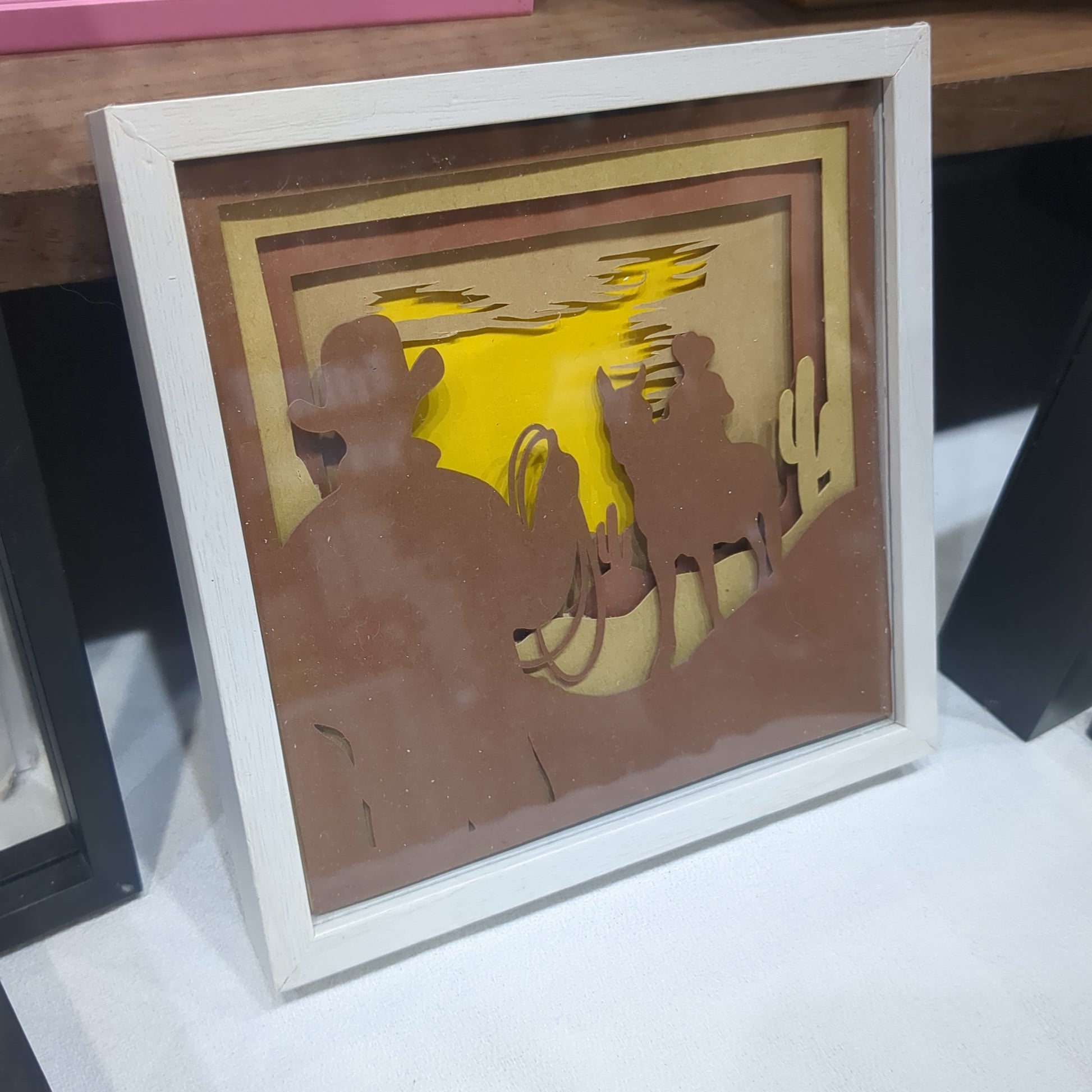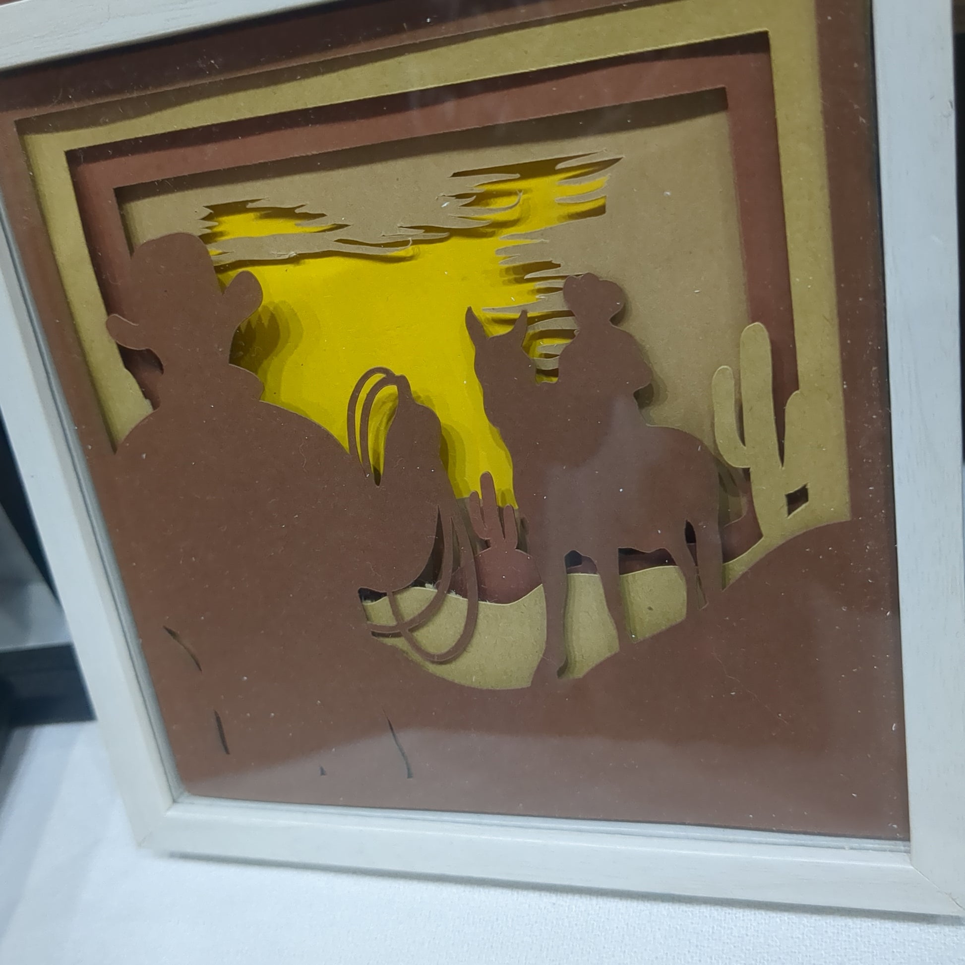 5 1/2 x 5 1/2” white shadow box with paper cut cowboy and dessert scene
