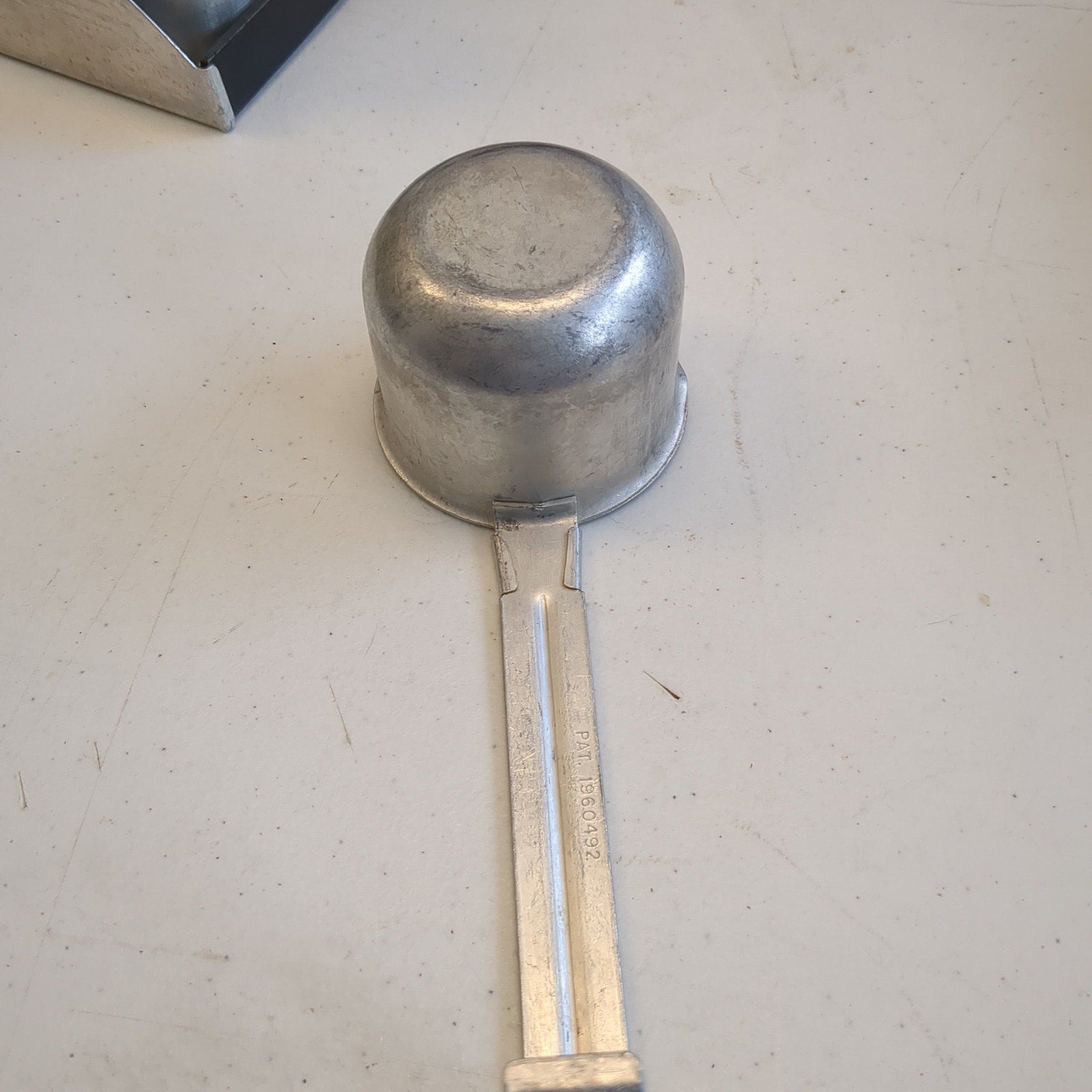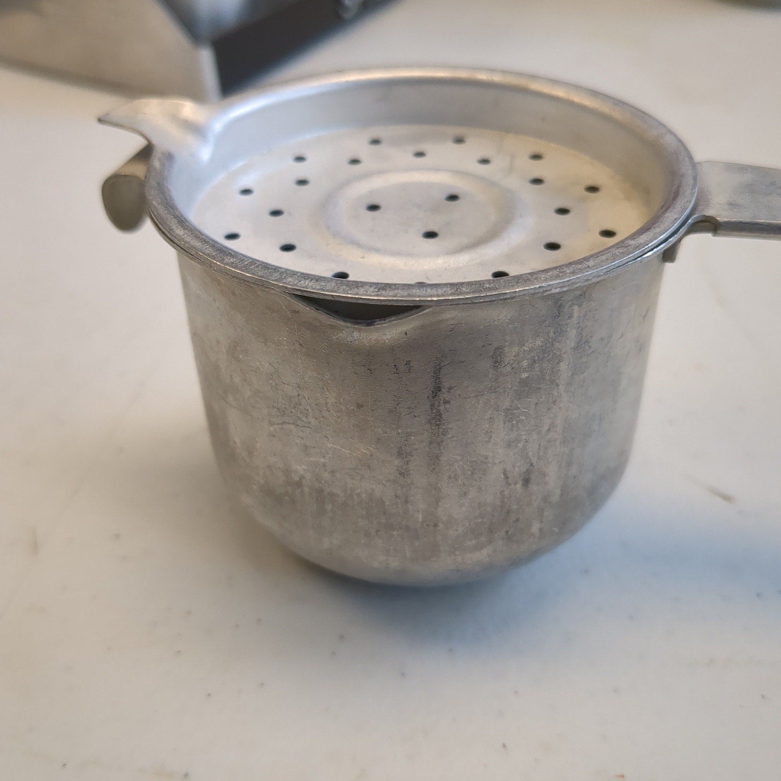 Vintage aluminum Sauce Melter with Strainer Lid. it is in vintage condition it has some patina is a neat unique little piece. I don't see any maker smart but there is a patent number on there. It does have some scratches. Please see photos as they are part of the description.
