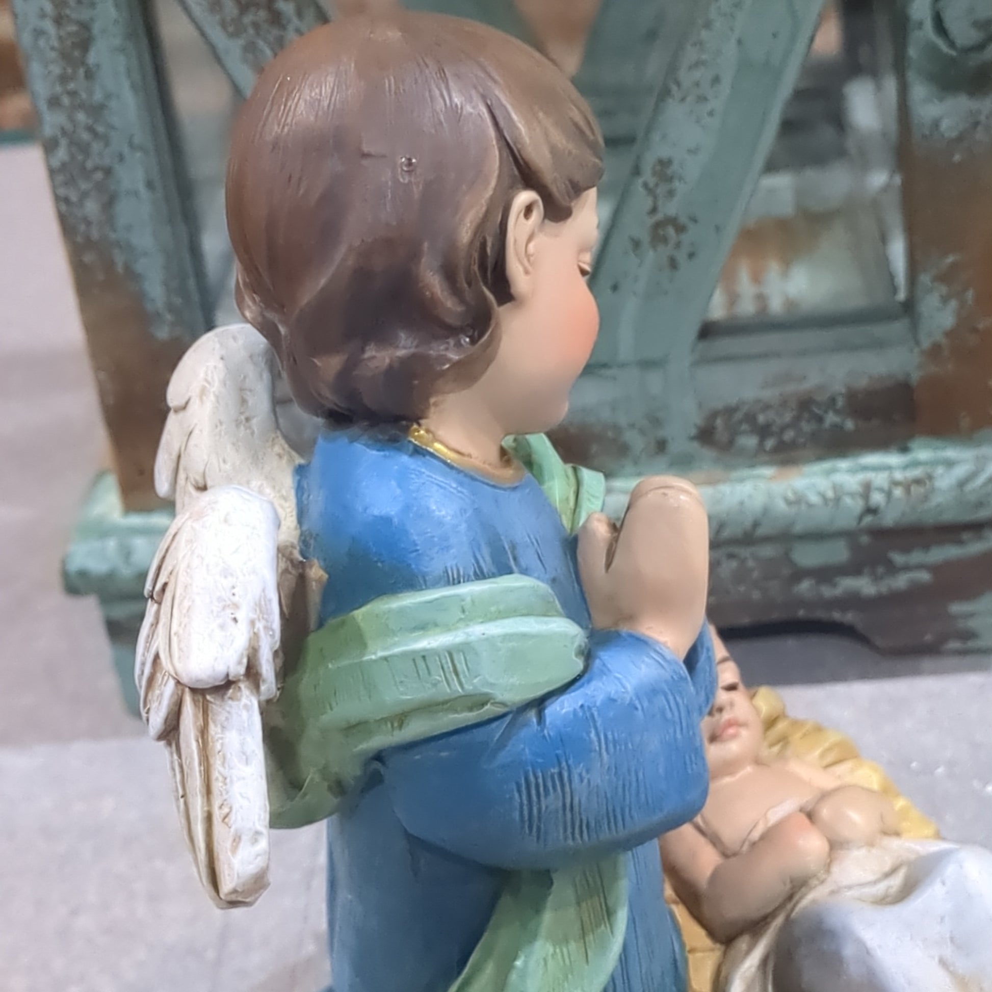 This polyresin figure is 6 1/2 inches tall. An angel praying over baby Jesus.