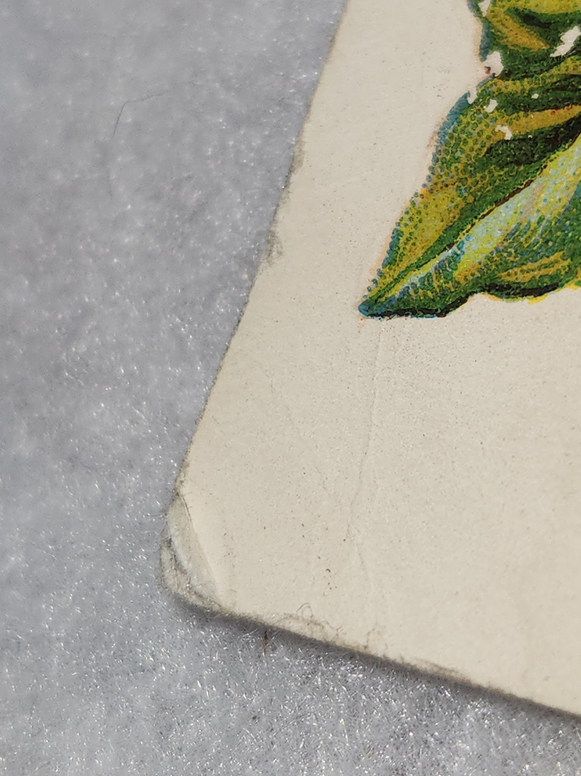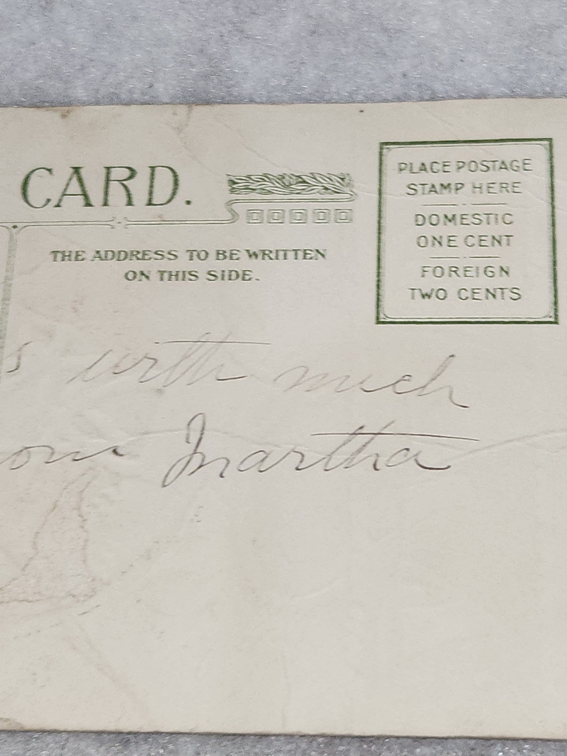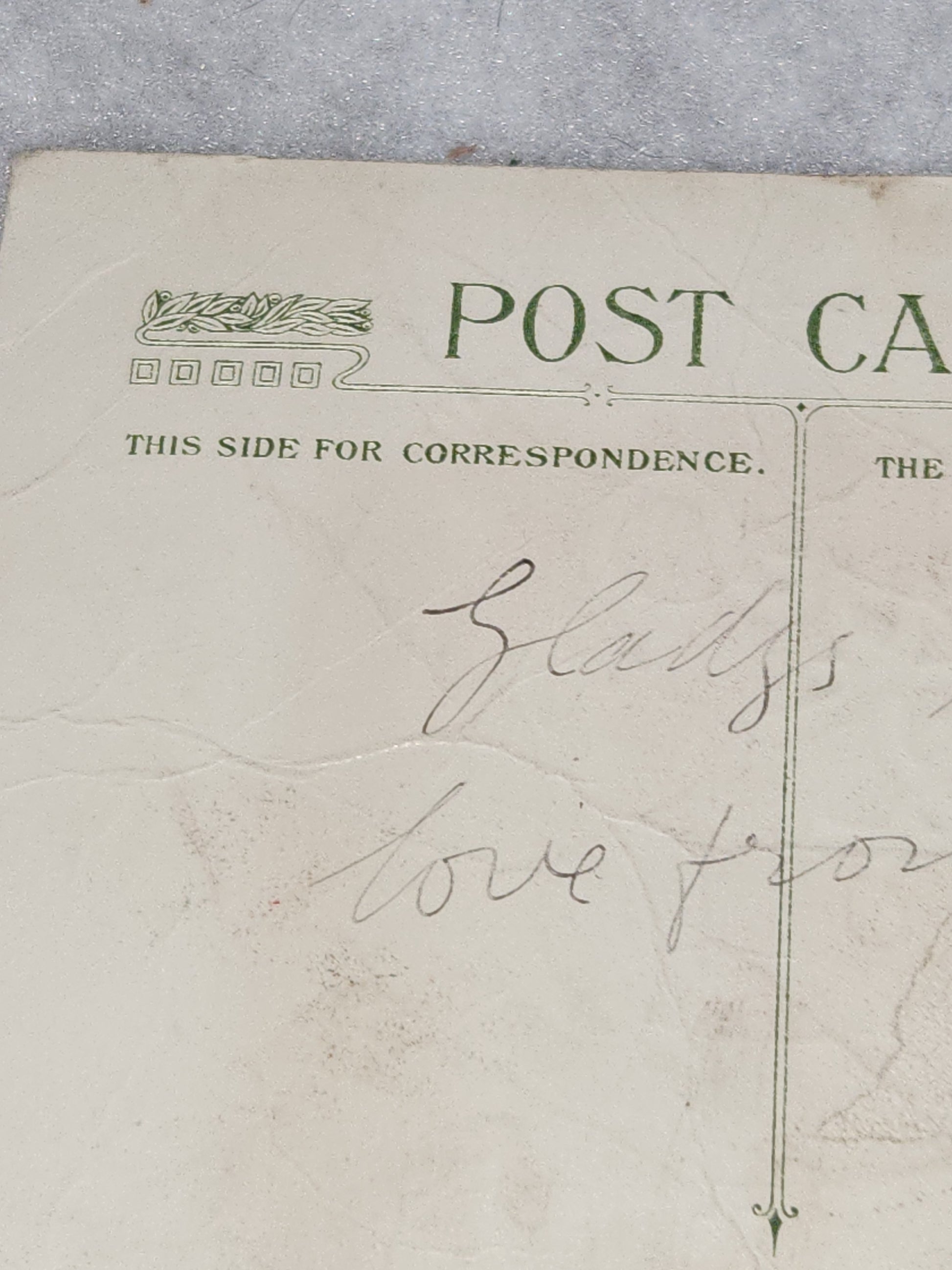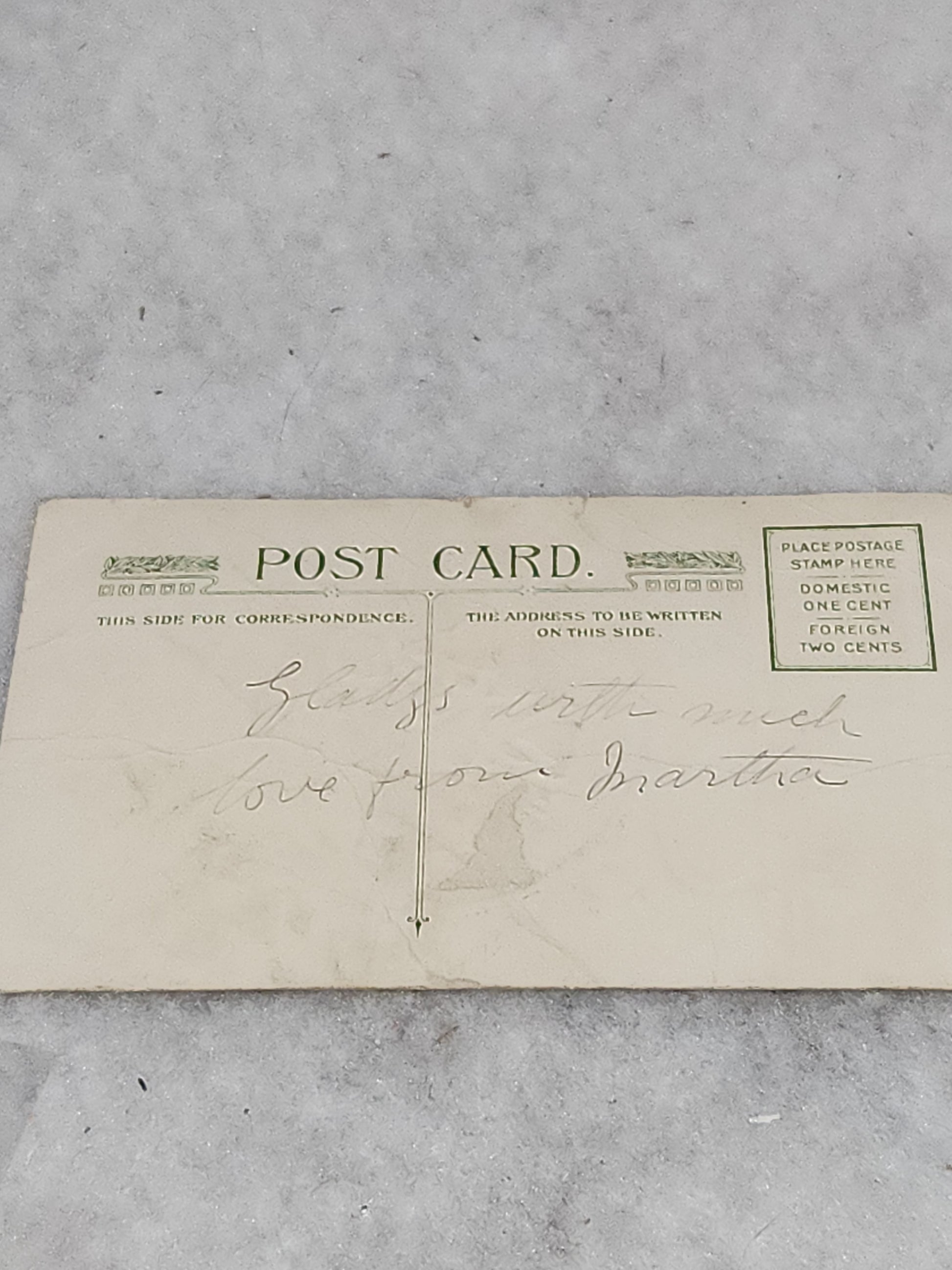 Normal postcard size. There is wear on edges and each corner has bend and maybe some paper loss. Please see photos closely as they will show you what you are receiving and are part of my description.