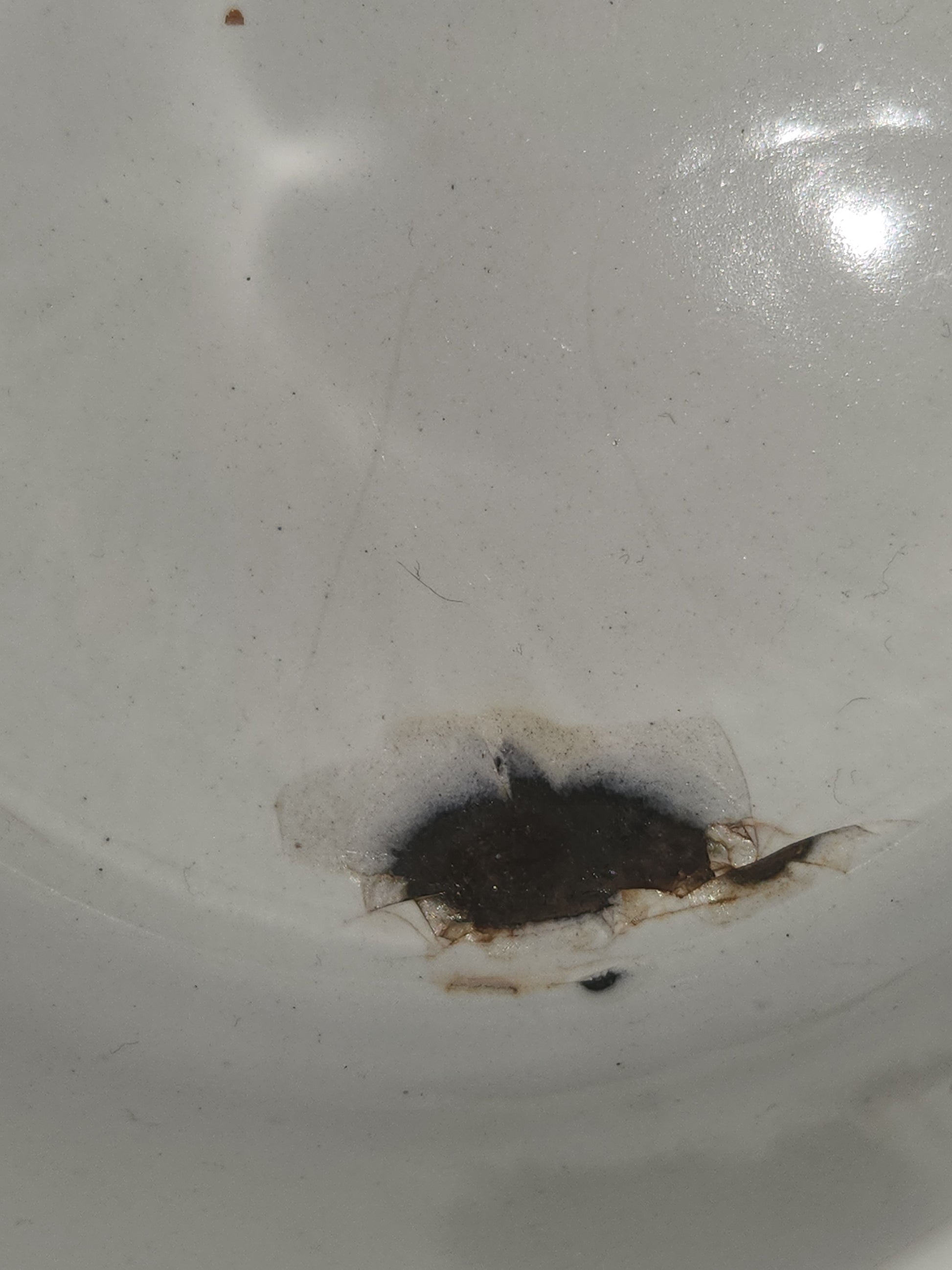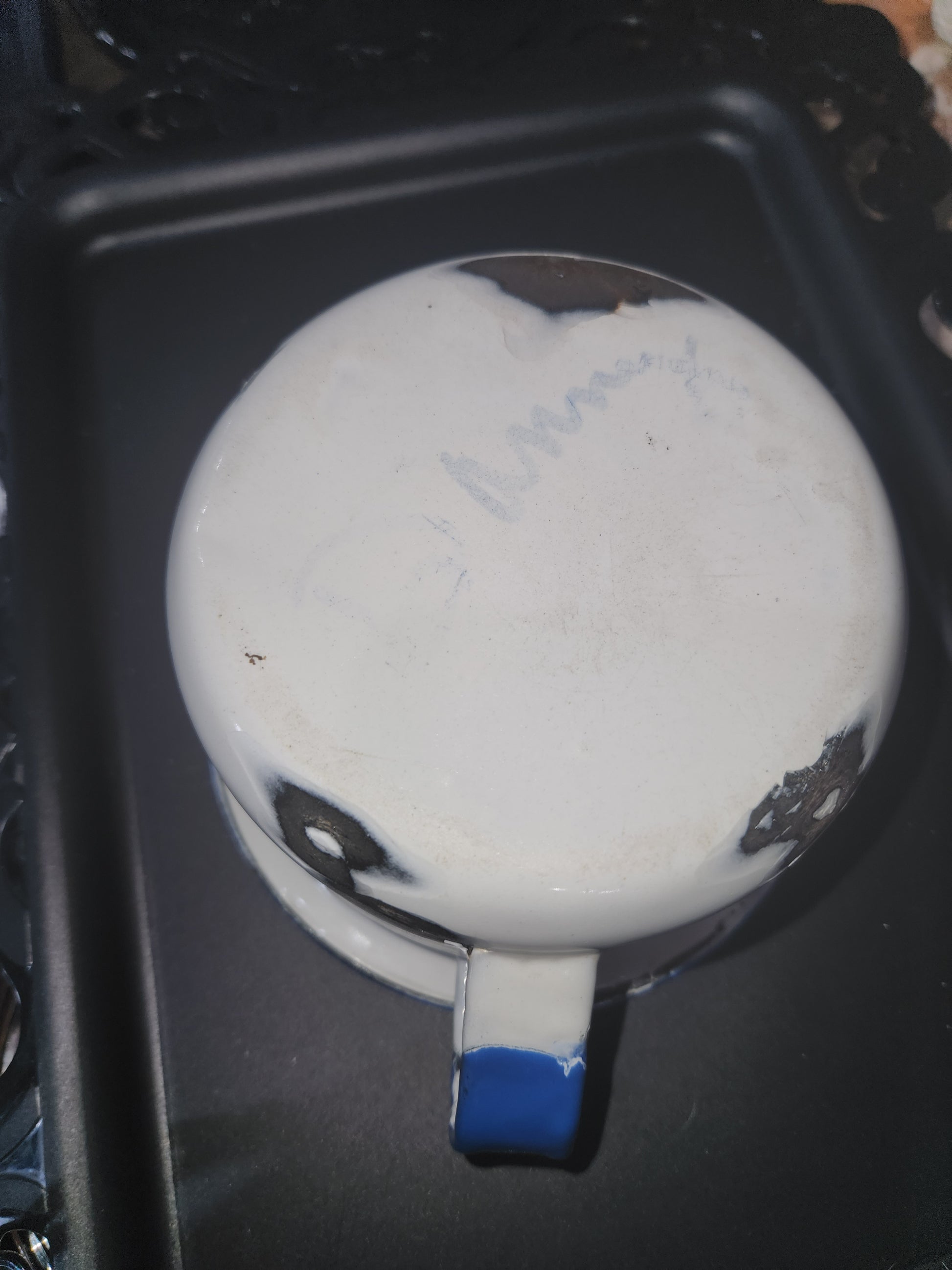 Vintage Childrens chamber pot or Enamelware cup. It is in fair condition with several chips and some rust. There is a faint name on the bottom. It has a nice handle, is 5 3/4" across the top and 3 1/2" tall. The bottom is 4 3/4" across and it is a white with light blue trim. Please see the photos as those are part of the description.