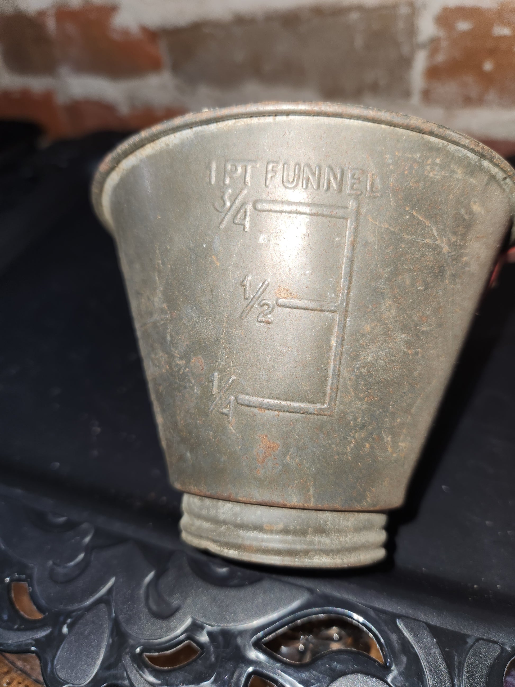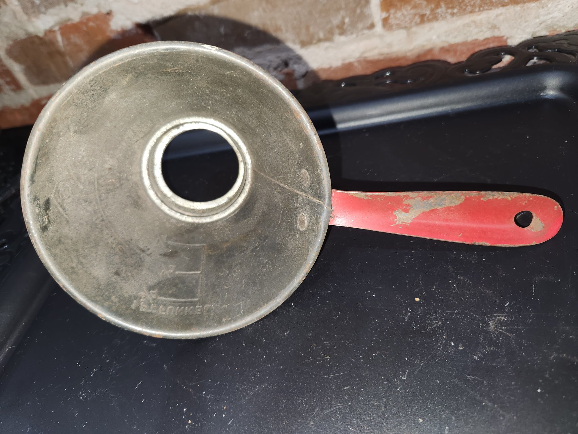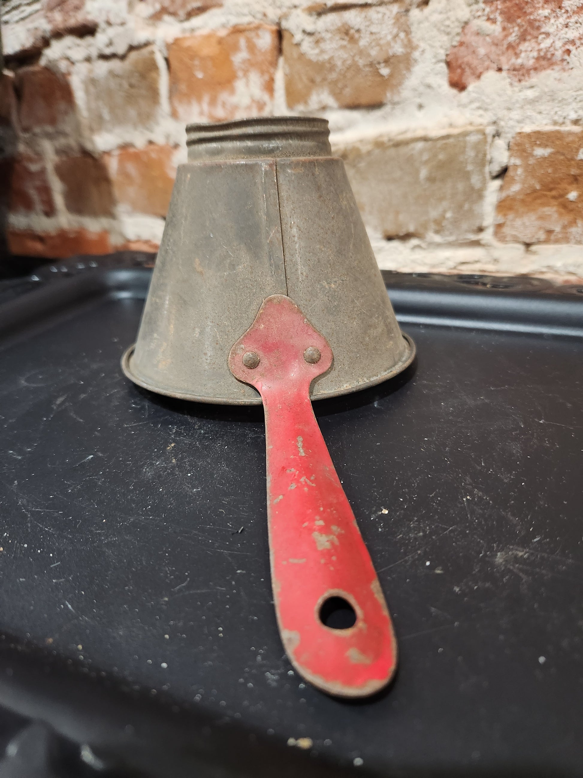 It has lots of patina, a little rust and a chippy red Handle. It sis just this funnel and nothing else. Please see photos as they are part of the description.