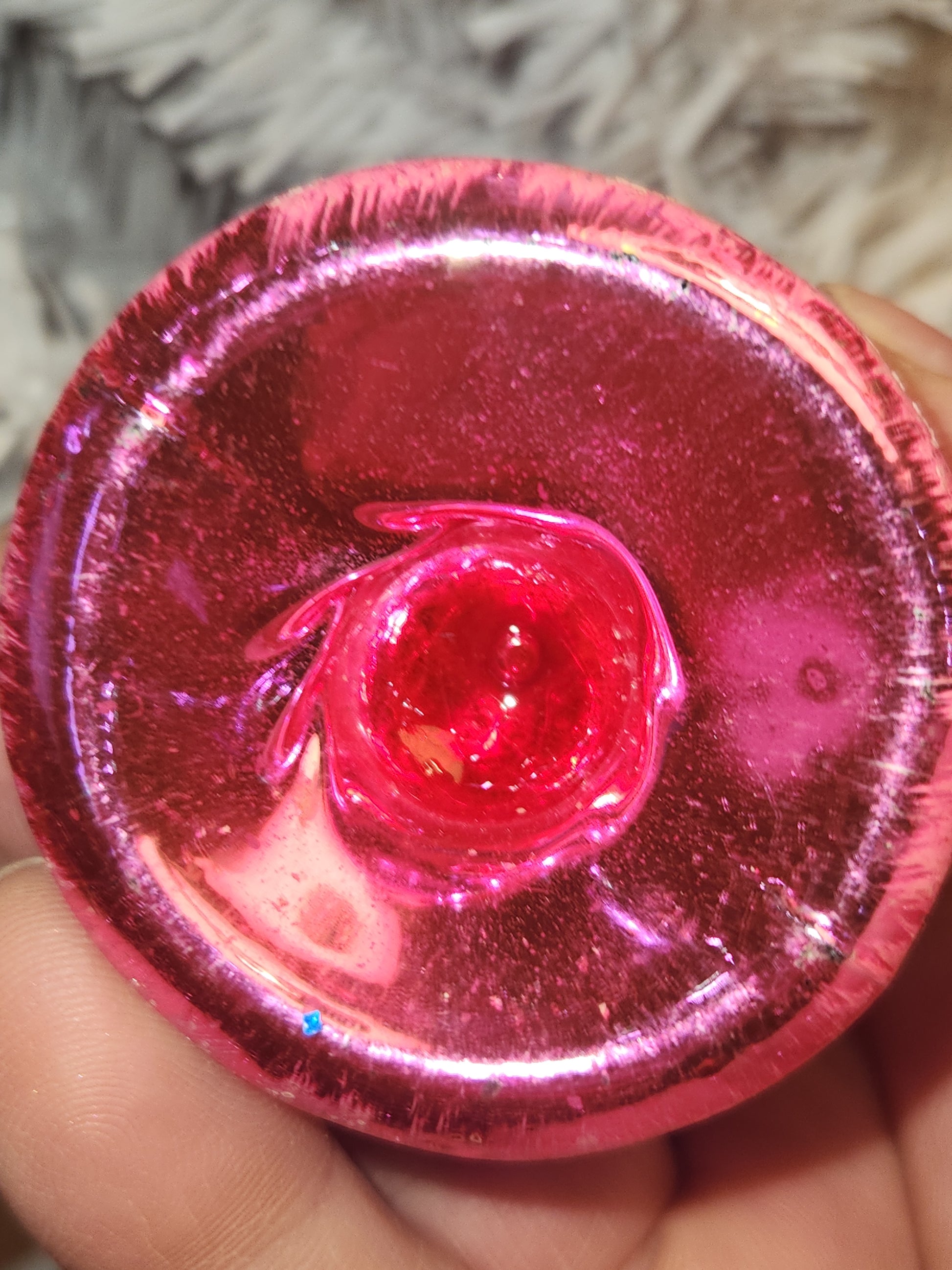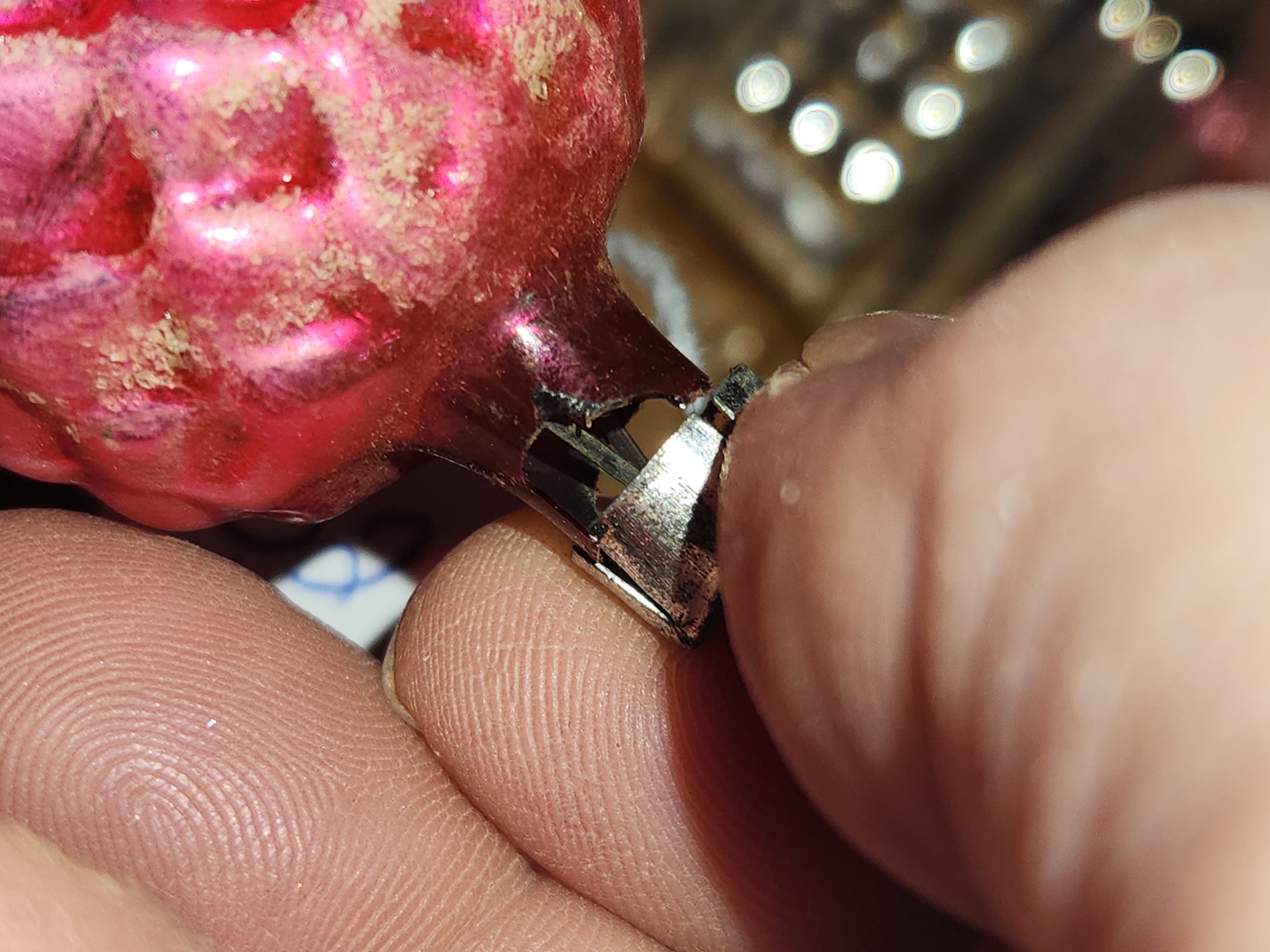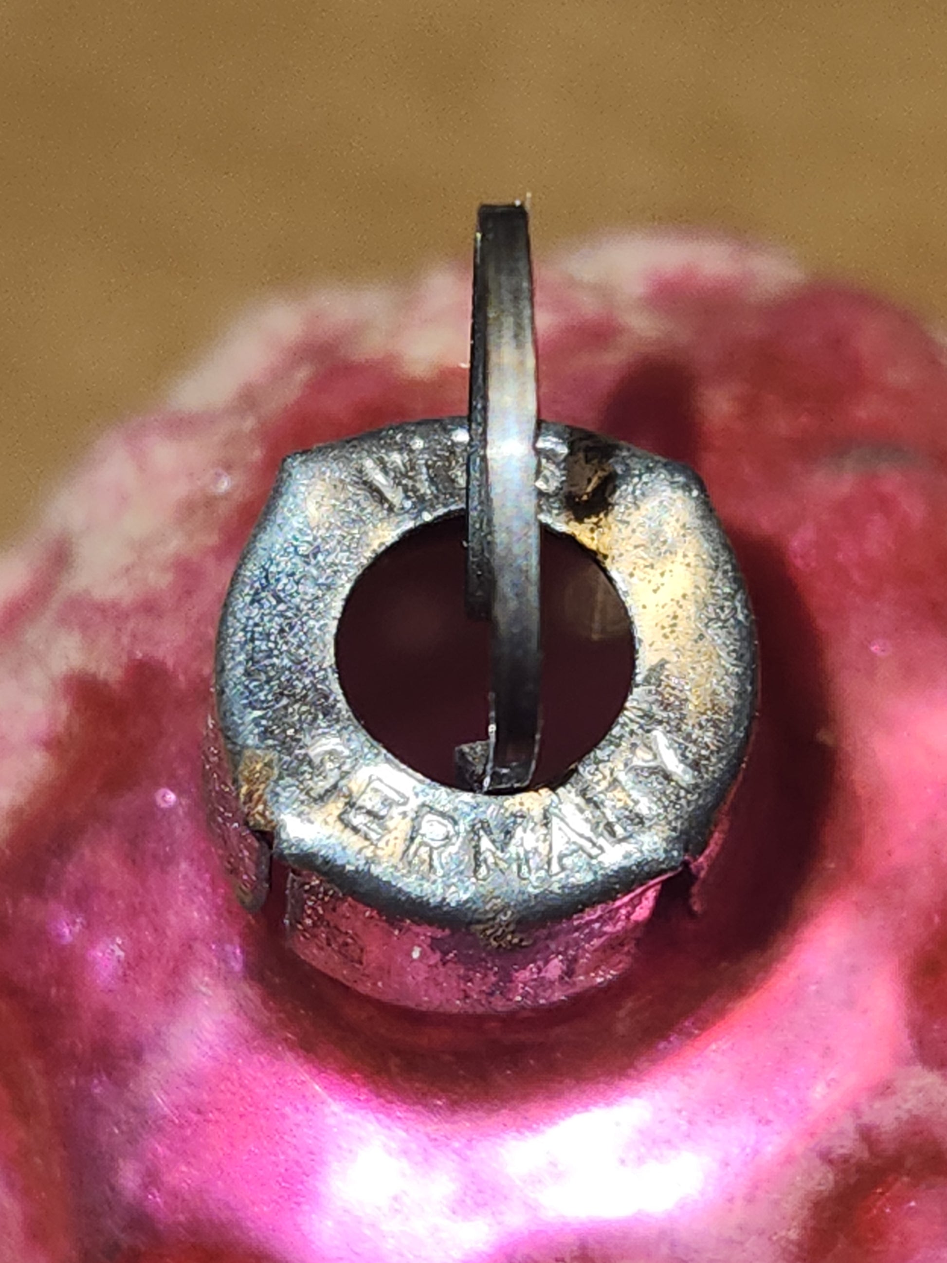 This ornament is in fair condition with no cracks or chips in the main ornamanet, but there are chips at the mouth, please see the photos of it. It us a pretty shade of hot pink. It is 3" to top of hanging loop. It glows under my UV light. When buying vintage ornaments please understand they can have crackling, crazing, discoloration and paintloss. Please be aware of that before ordering. Please see photos as they are part of the description