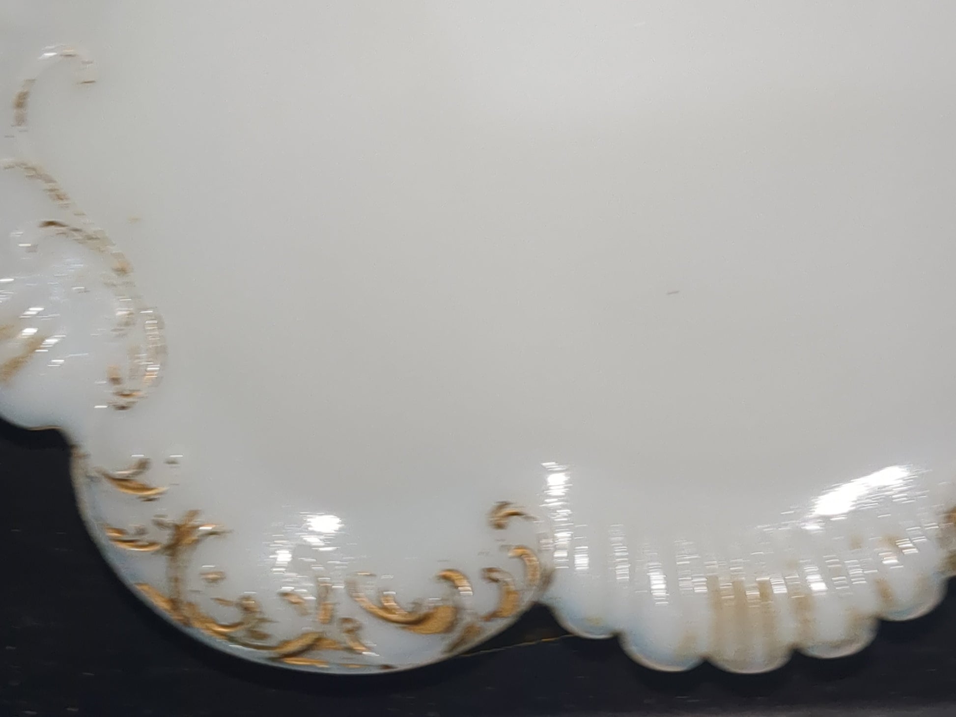 Antique Vanity Milk Glass Tray, milk glass with gold paint, Dresser Set Piece.9 inches long, 6 inches wide. Made in 1920's. No Maker's Mark is present so it is an Unknown Glass Company. I feel not see any chips or cracks. A lot of the gold has rubbed off. It is a great piece of milk glass. Please see photos as they are part of the description