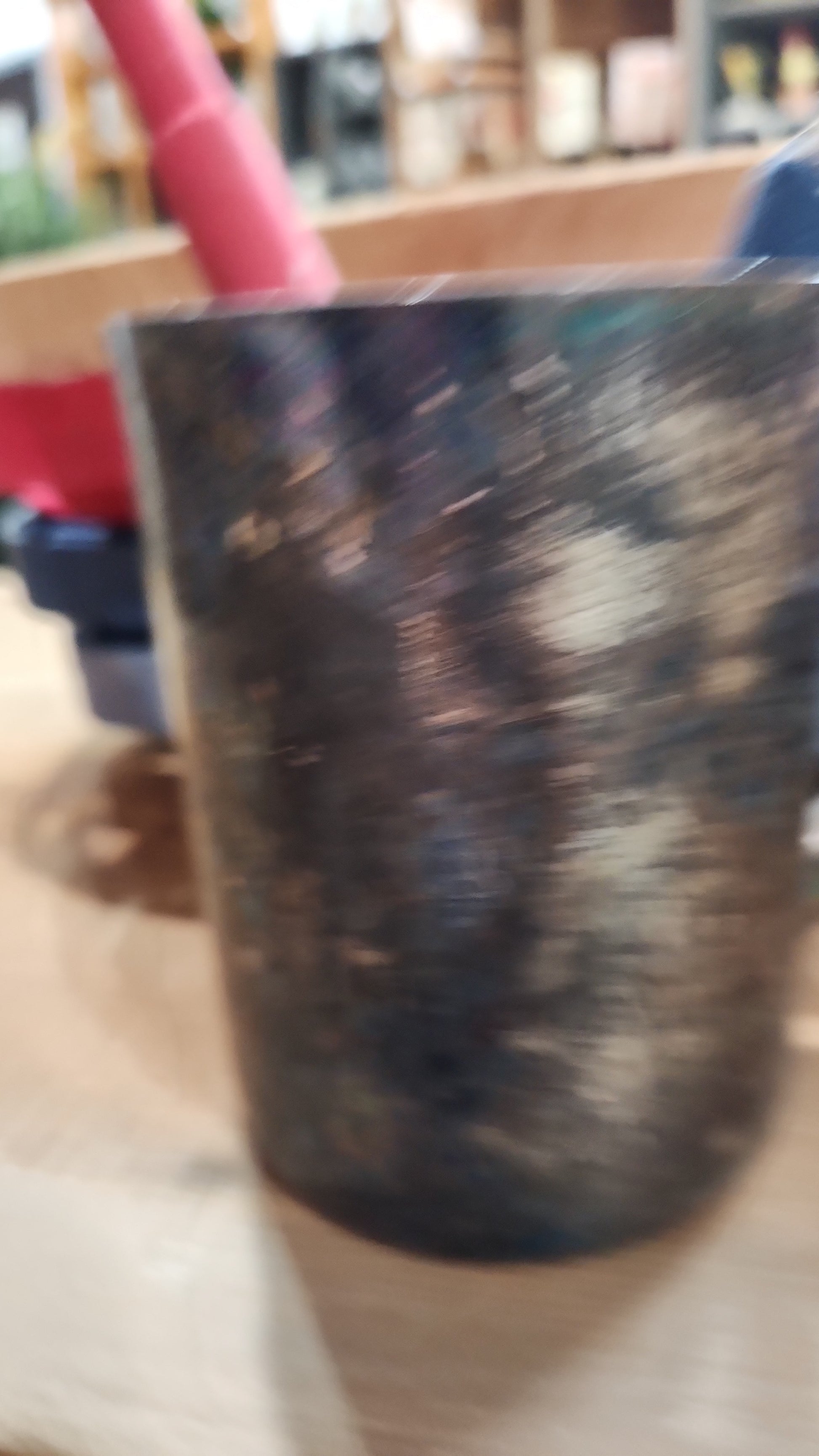 check out the gorgeous patina on this cup. They do not make them like this anymore. I am certain it can be polished. it is heavy. 4 inches tall 3 inches in diameter. The accessories inside cup will be included