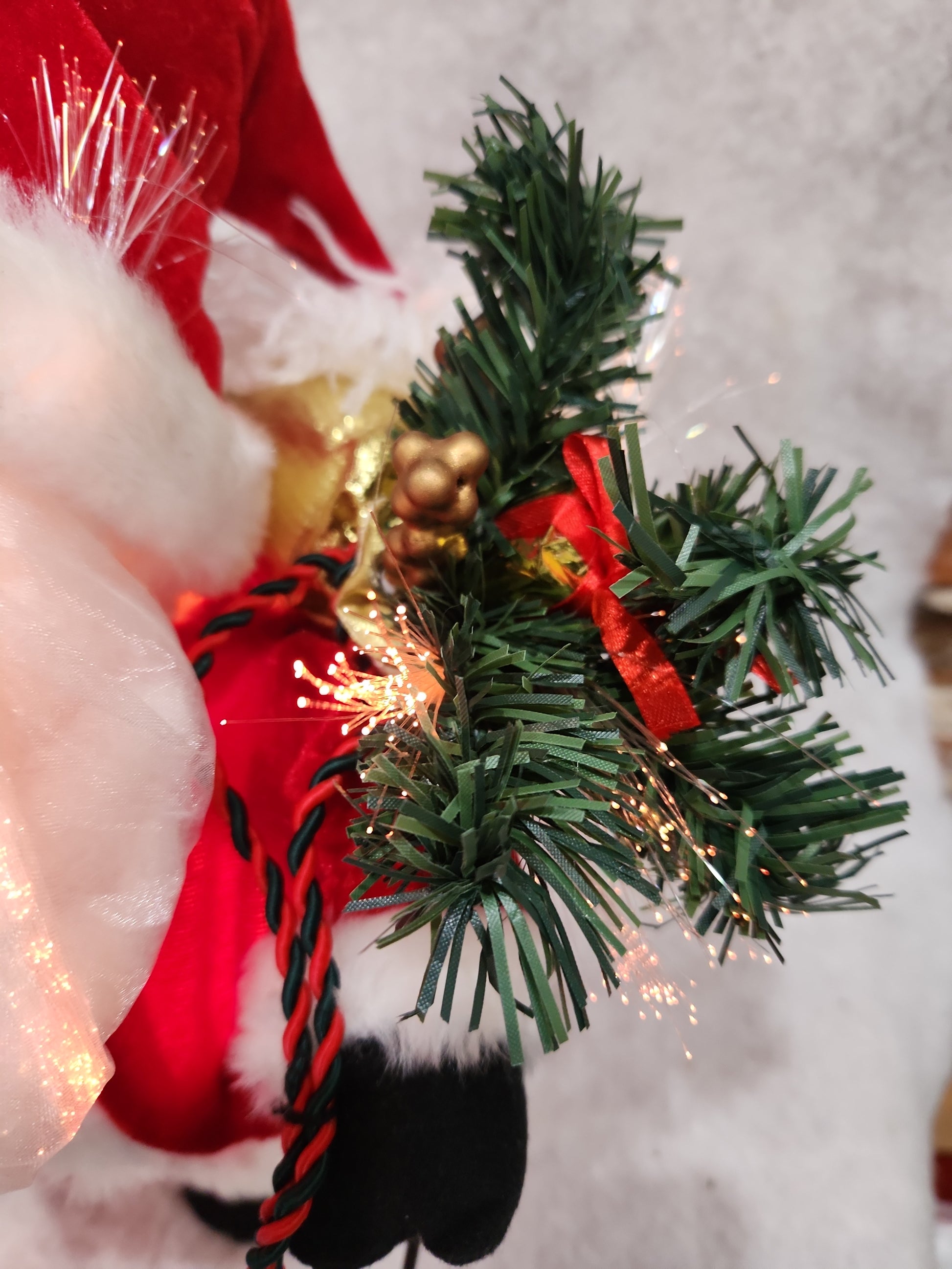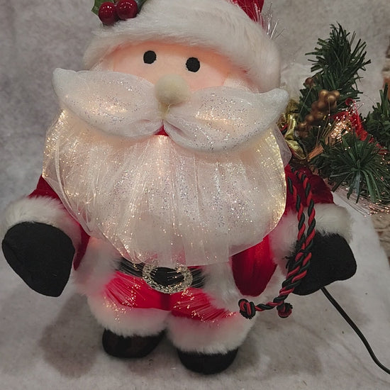 This santa is in good condition. He works. He is 11 1/2" tall and 10 1/2" from arm to tip of greenery. Please see all photos as they are part of the description.