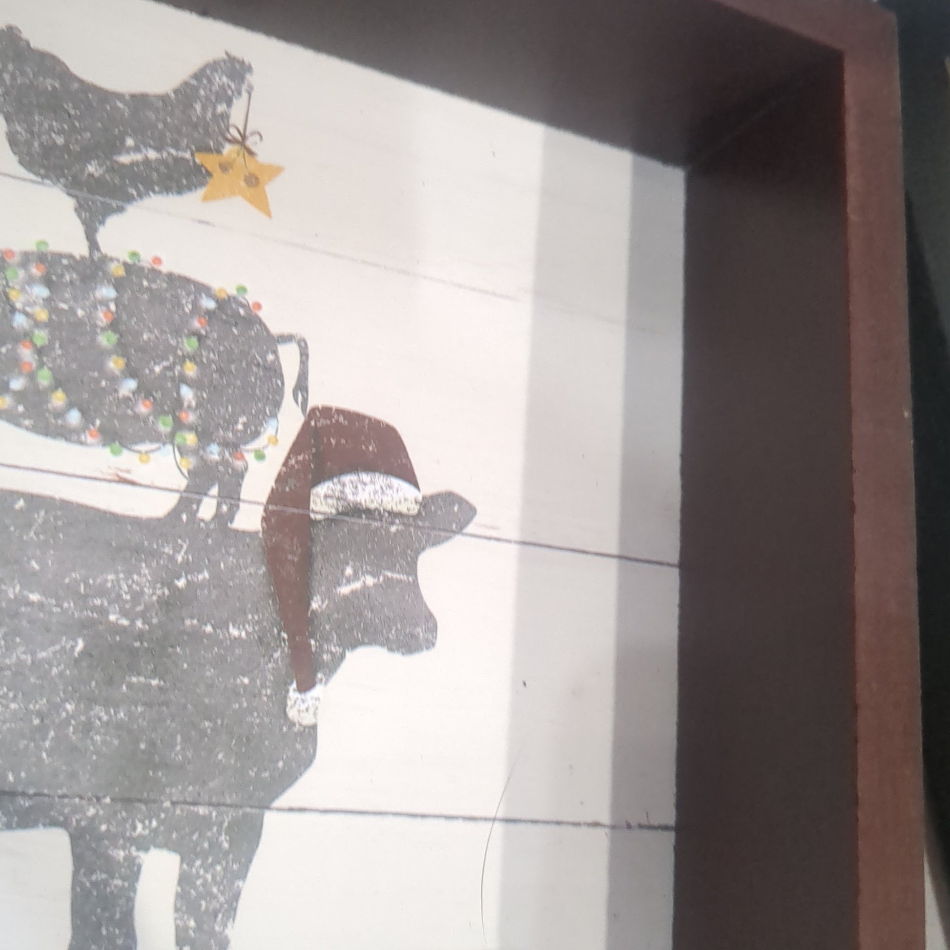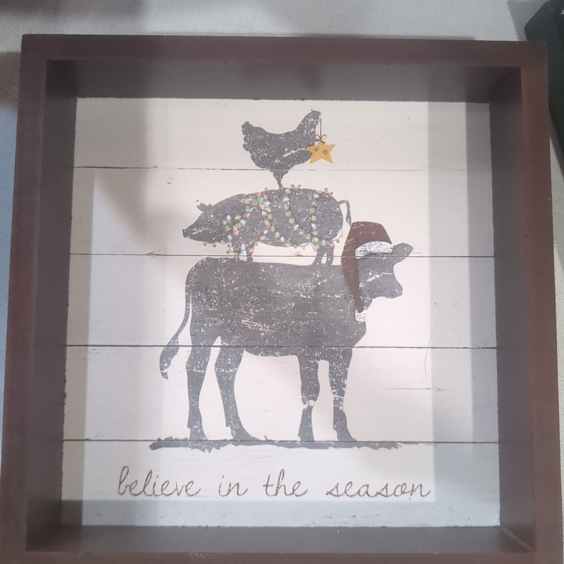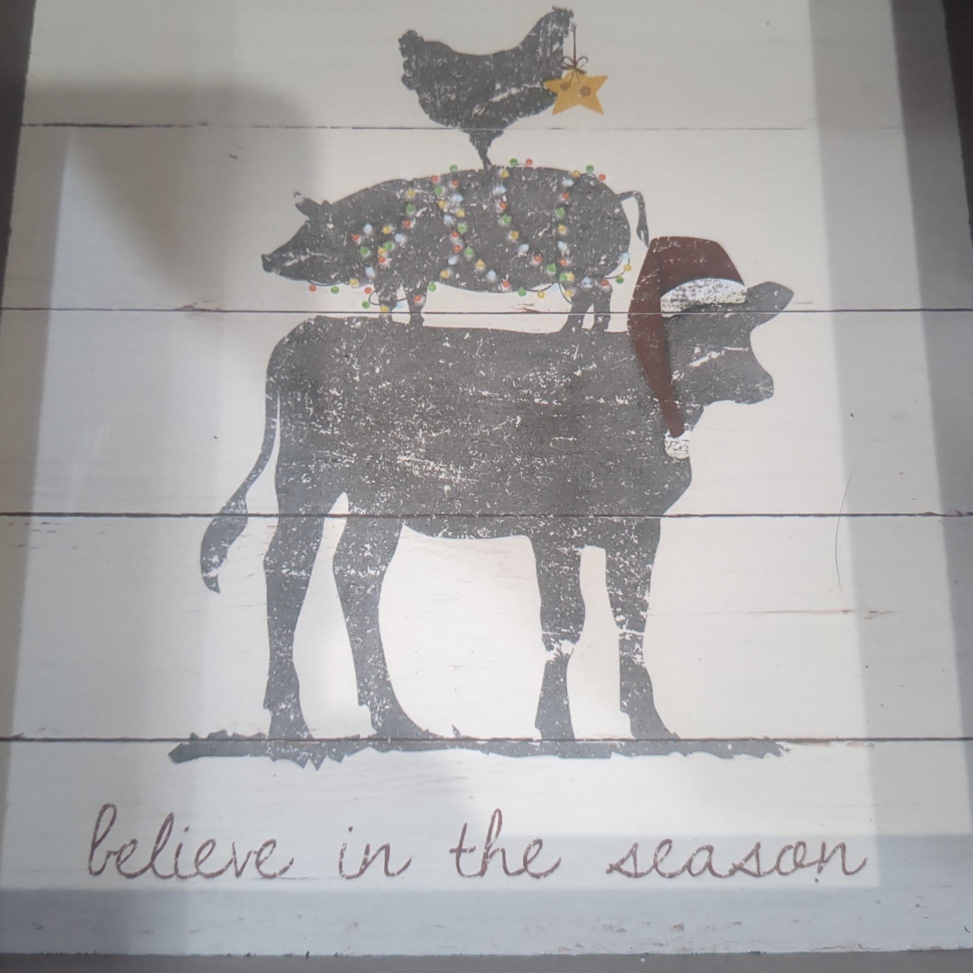 Believe in the Season Box Sign, is a painted box sign with an old burgundy finish. Off-white, shiplap background and distressed animal silhouettes. The illustrations are dressed in Christmas items and it reads, "believe in the season" in script text. Sign has a sawtooth hanger, but looks great sat on a console table or mantelpiece. Measures 7" squared by 1.5" deep.