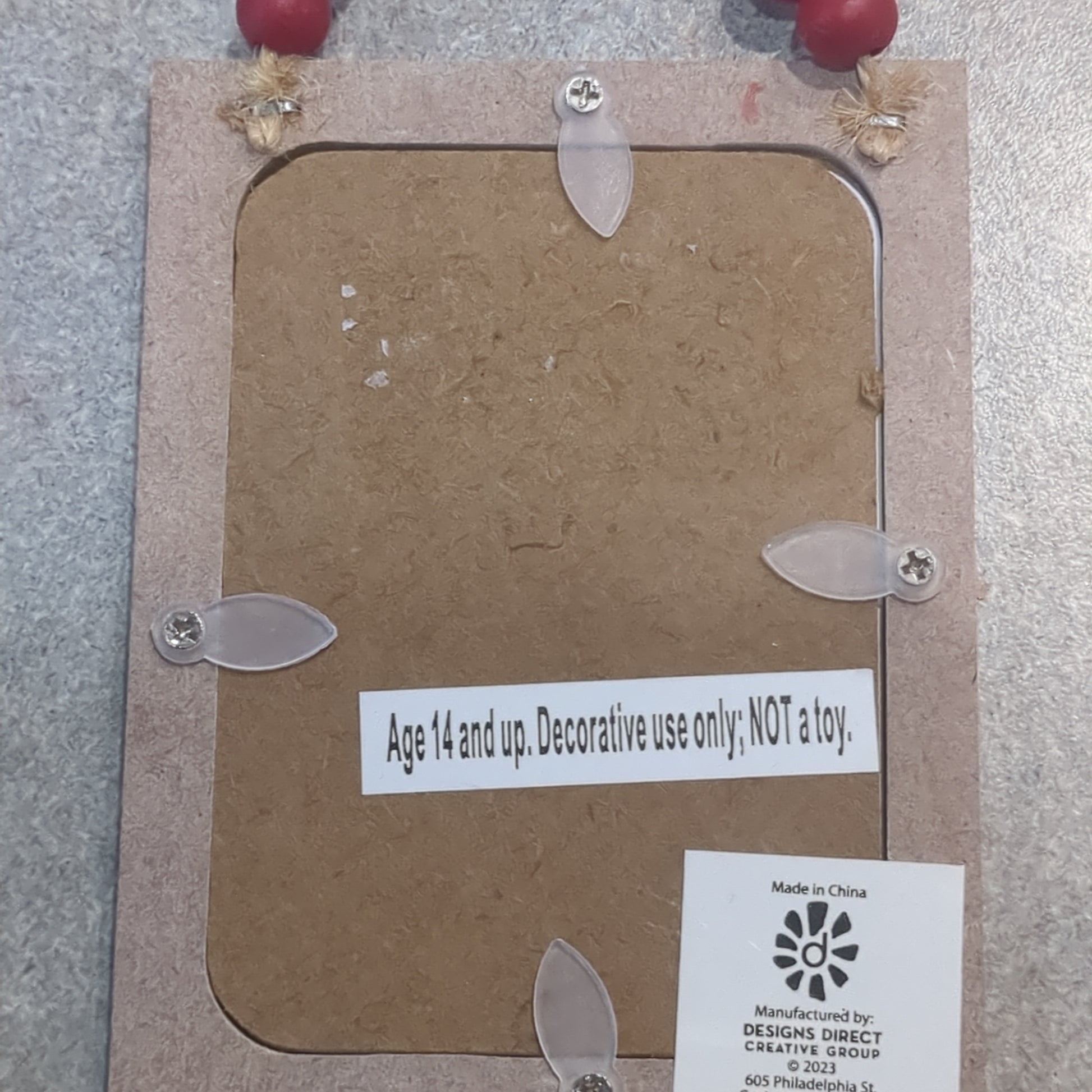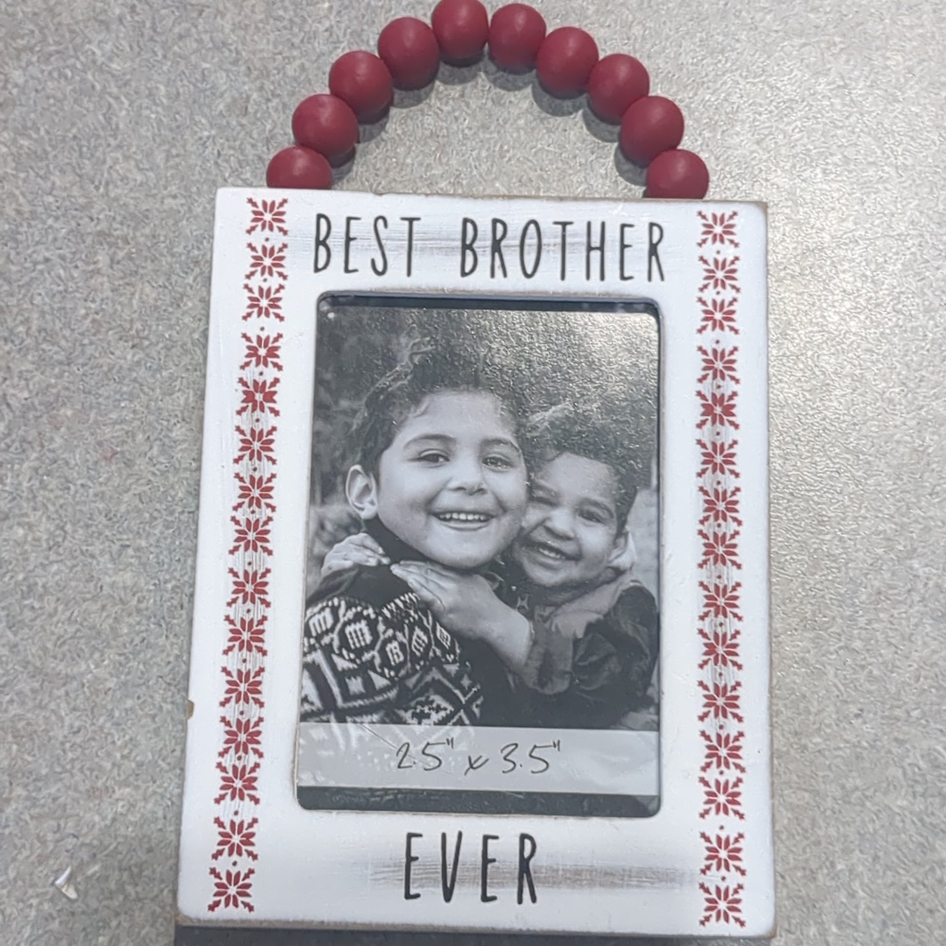 Best brother ever photo frame it has red wood beads for a hanger it's white and appears distressed. Is 4 in by 3 and 1/4 in The area for a picture is 3 in by 2 in