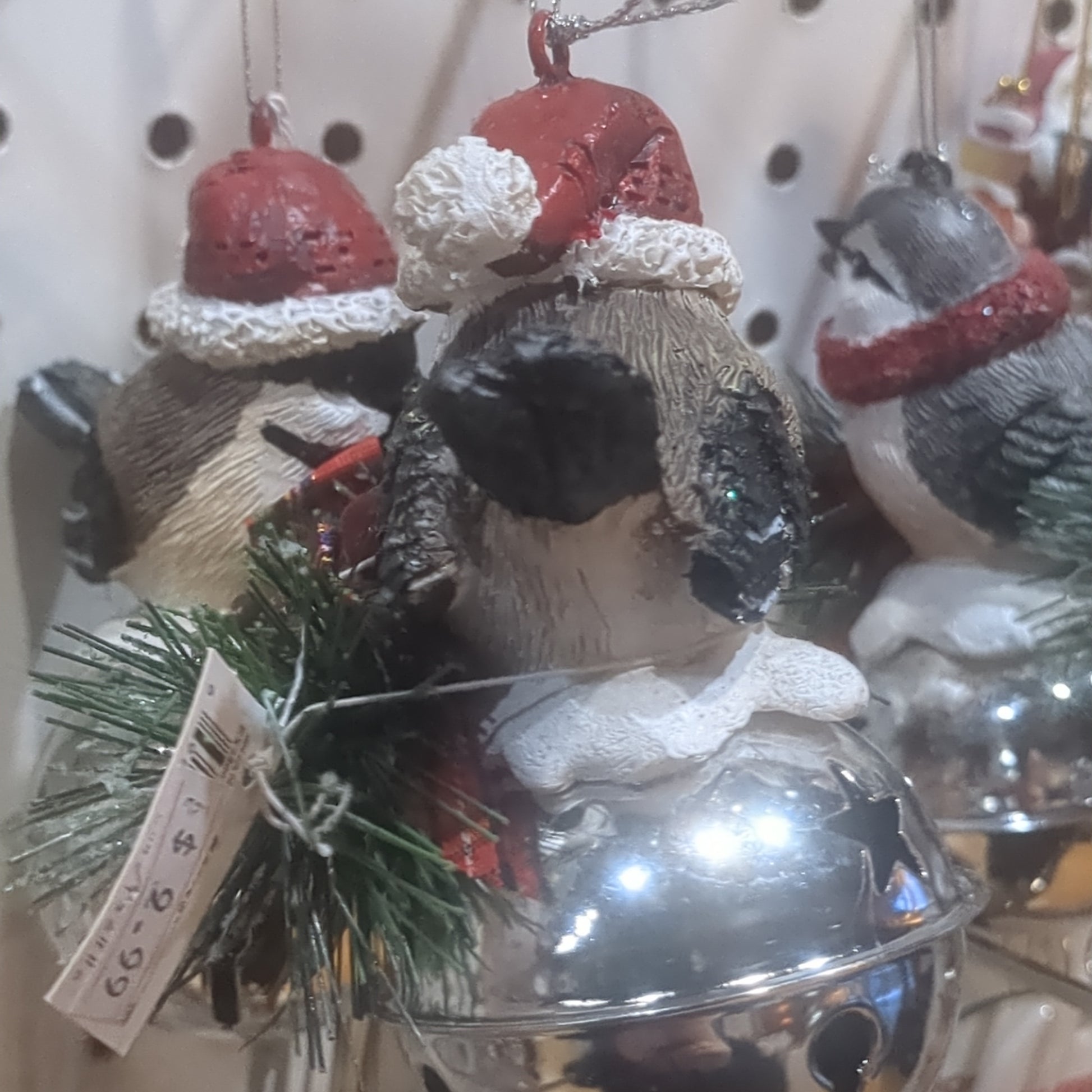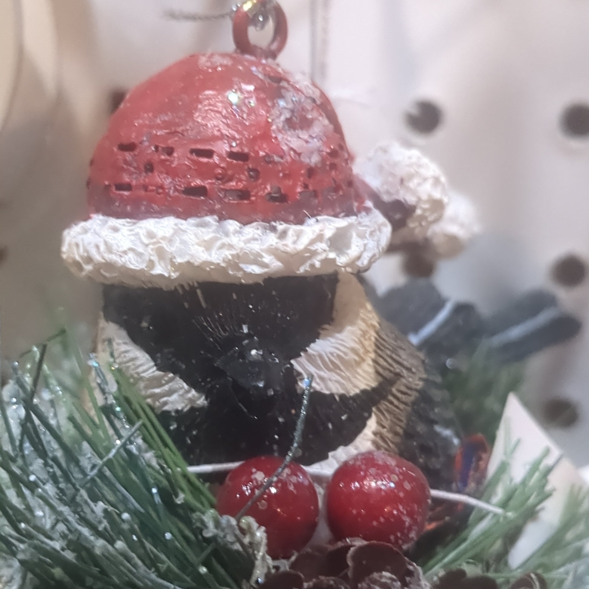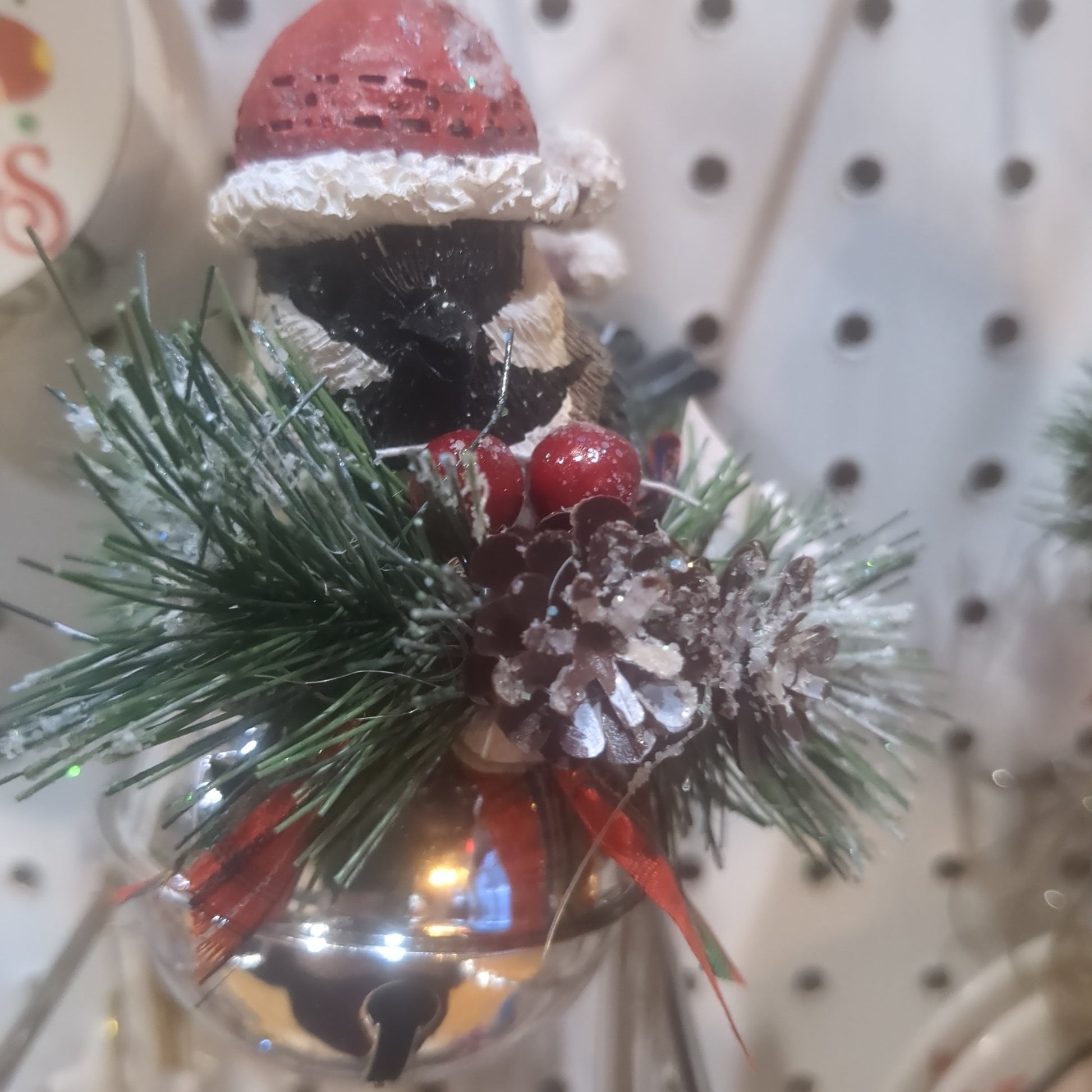 Black, tan and white bird on greenery and bell. It is wearing a red hat and there's a little plaid ribbon with it. It is 4 and 1/2 in tall