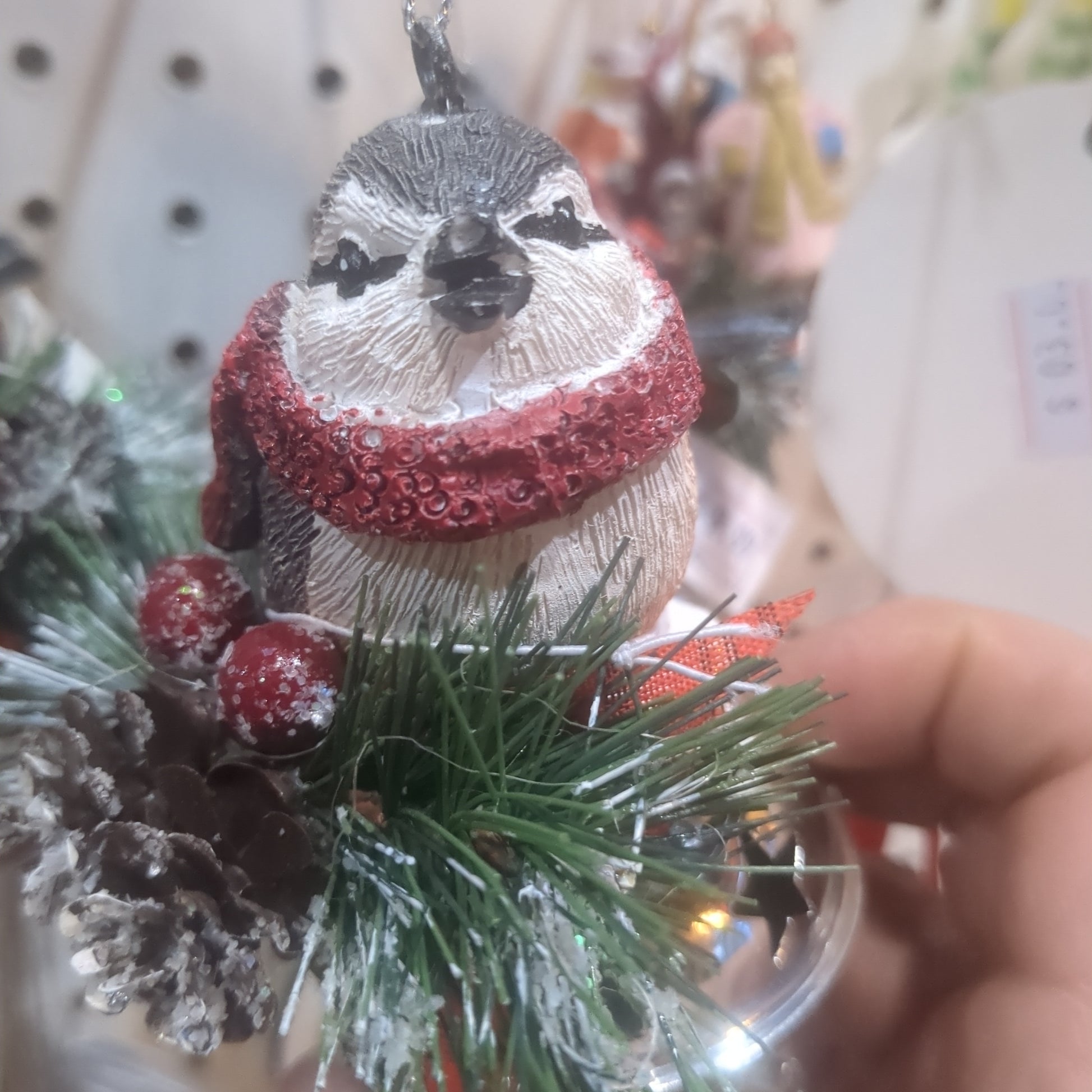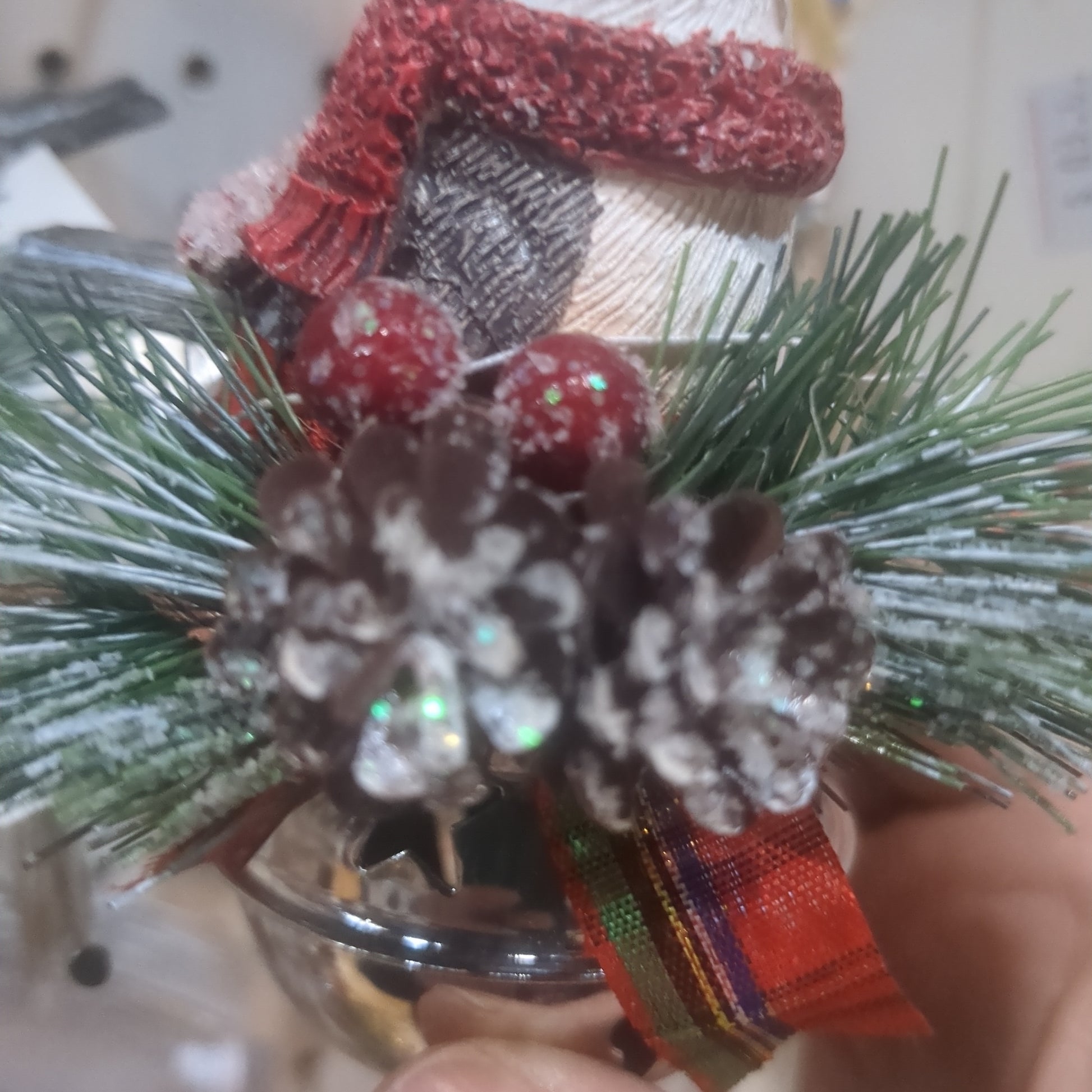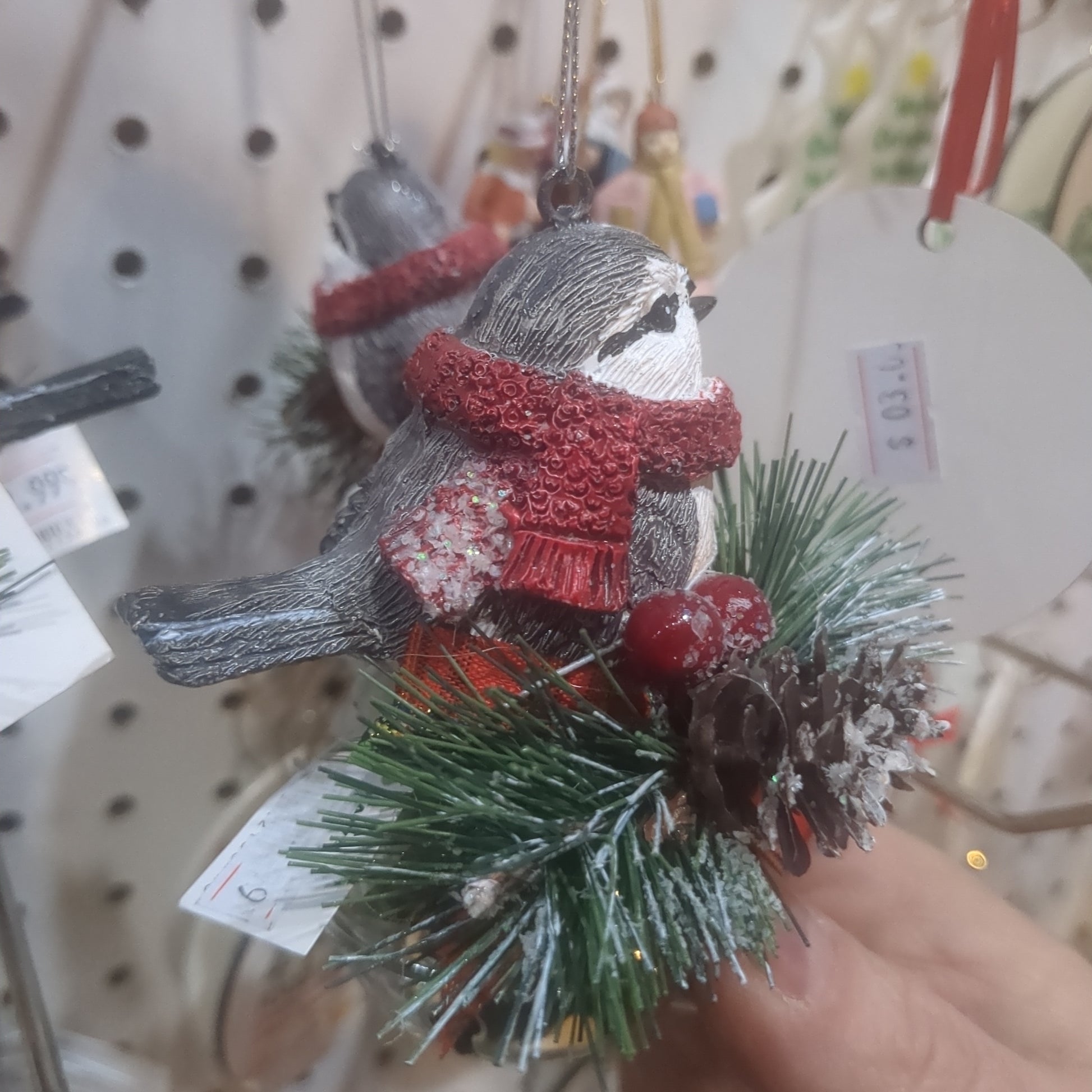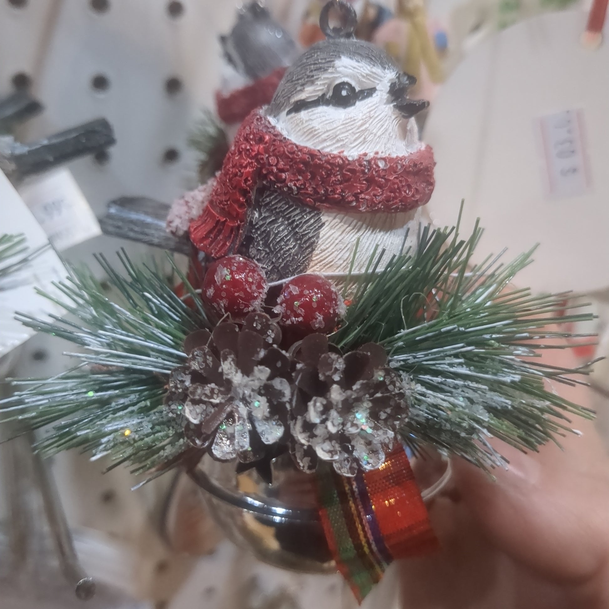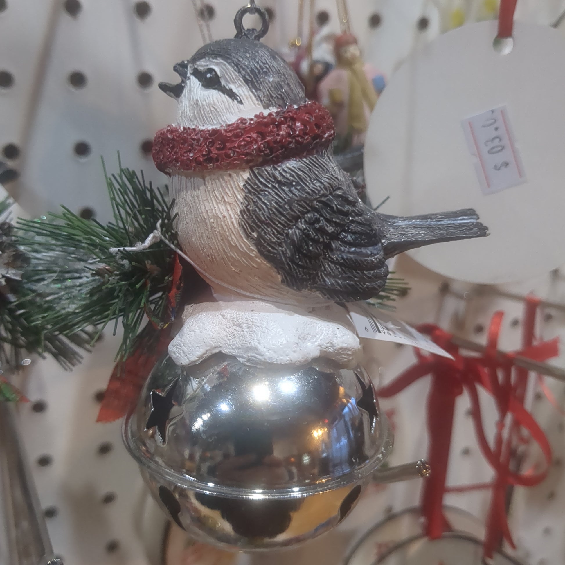 Grey bird on greenery and bell. It is wearing a red scarf and there's a little plaid ribbon with it. It is 4 and 1/2 in tall